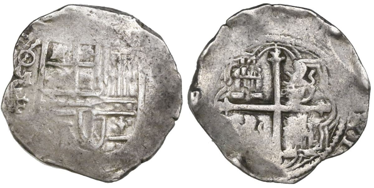 Mexico City, Mexico, cob 4 reales, Philip II, assayer oF below mintmark oM to left, rare. S-M13; KM-36; CT-unl. 13.56 grams. Full oMoF to left, most of shield and cross (the latter with toning in crevices), AVF with flat areas, first example of this assayer we have offered.
