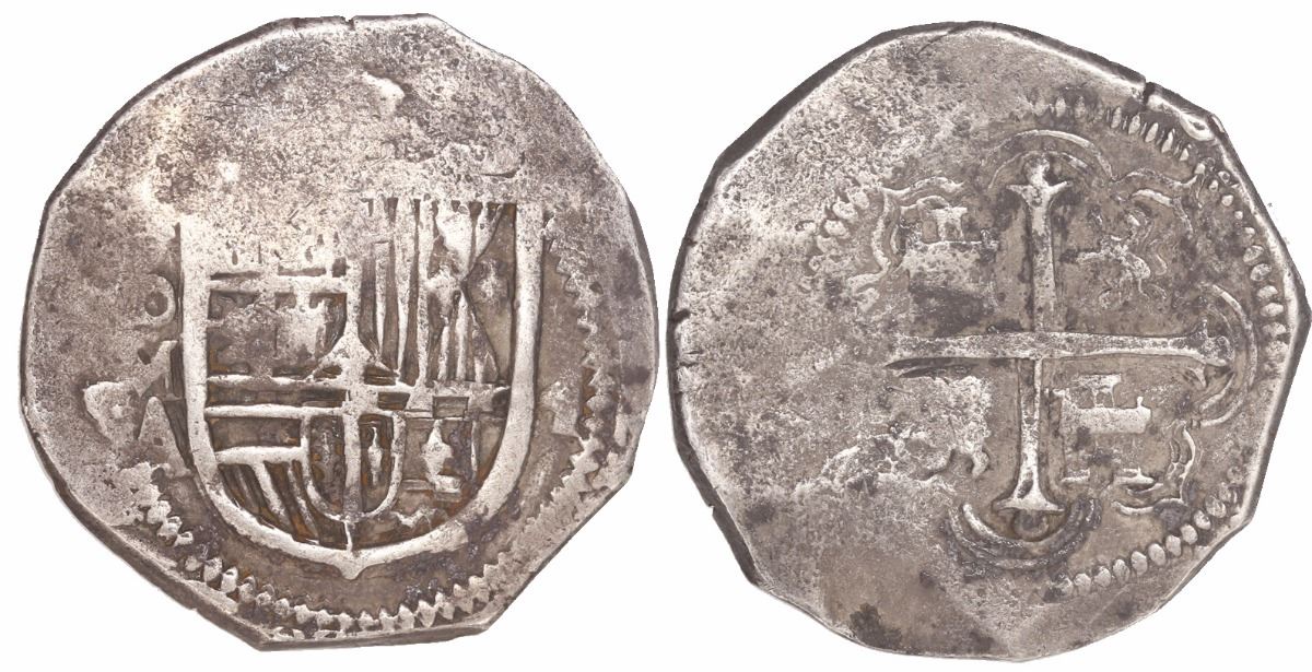 Mexico City, Mexico, cob 4 reales, Philip III, assayer A. 13.41 grams. Nearly full shield and cross, clear oMA, toned VF+ with flat peripheries.