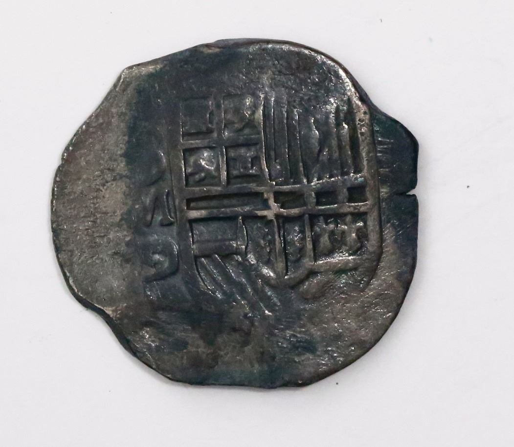 Mexico City, Mexico, cob 4 reales, Philip III, assayer D/F (ca. 1618). S-M18; KM-unl (37.2 for type). 13.59 grams. Nice full cross and shield, no corrosion (full weight) but some dark "horn silver," darkly toned all over, with clear oMD/F (scarce). Recovered from: "Lucayan Beach wreck," sunk ca. 1628 off Grand Bahama Island
