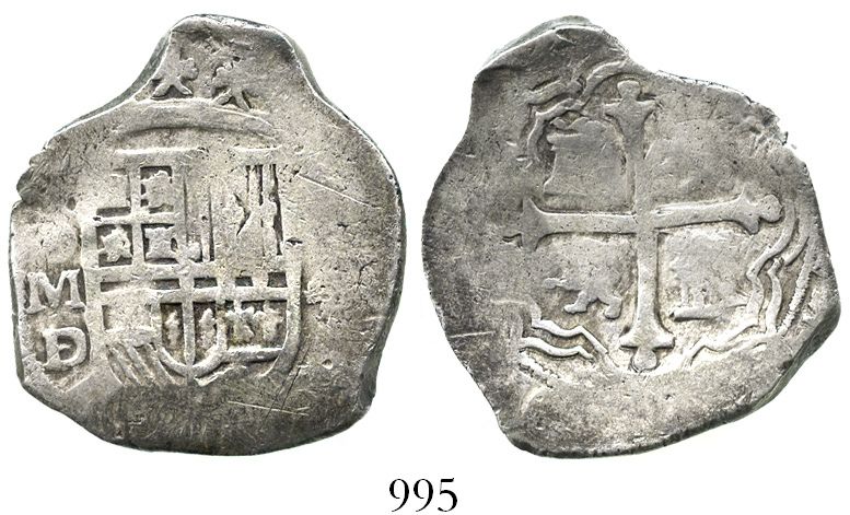Mexico City, Mexico, cob 4 reales, Philip III, assayer D/F. S-M18; KM-37.2. 13.8 grams. Very bold full oMD/F, full shield and cross but all a bit weak (Fine with flatness), nicely toned, somewhat interesting shape.