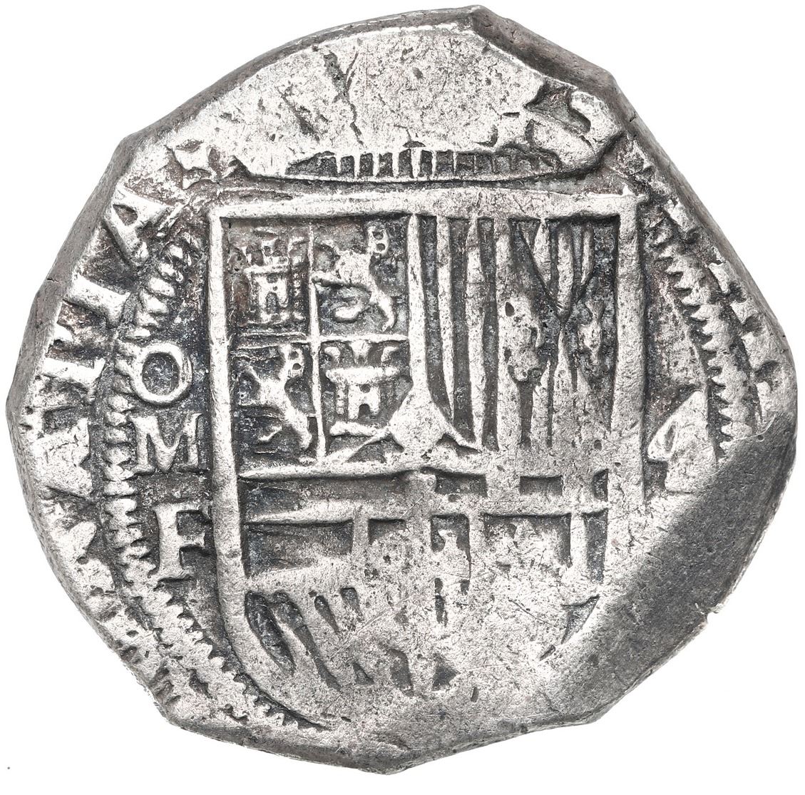Mexico City, Mexico, cob 4 reales, Philip III, assayer F, Grade 1. S-M12a; KM-37.1; Cal-745. 13.74 grams. Exceptionally choice and uncorroded, with bold oMF and denomination 4, well-detailed full shield and cross, clear GRATIA in legend where the date would be the later type, nicely toned in crevices. With Fisher tag and photo-certificate 85A-125030. From: Atocha, sunk in 1622 west of Key West, Florida