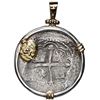 Mexico City, Mexico, cob 4 reales, Philip III, assayer not visible, Grade 2, ex-Atocha (1622), mounted cross-side out in silver bezel with 14K gold prongs and shackle bail, pirate-face and galleon embellishments. 24.43 grams total. Perfectly round (the coin probably rounded on edge) with good full cross but flat periphery, the galleon completely covering the back. From the Atocha (1622), with Fisher tag and certificate 85A-125860.