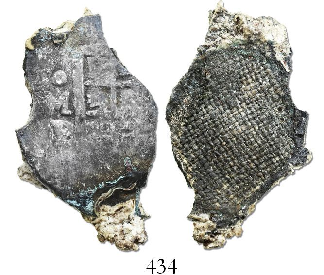 Mexico City, Mexico, cob 4 reales, Philip IV, assayer P, with canvas-bag remains on shield. S-M19; KM-38. 13.43 grams. Fragmentary coin but desirable as bearing the original cloth on one side, flanked by coral patches, the other side showing clear mintmark oM. With certificate. Recovered from: Concepcion, sunk in 1641 off Hispaniola