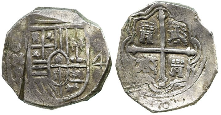 Mexico City, Mexico, cob 4 reales, Philip IV, assayer P, with test-cut as from circulation in the Orient. S-M19; KM-38. 13.8 grams. Roundish flan with very choice full cross-lions-castles, nice full shield with oMP and 4 to sides, richly toned XF+.