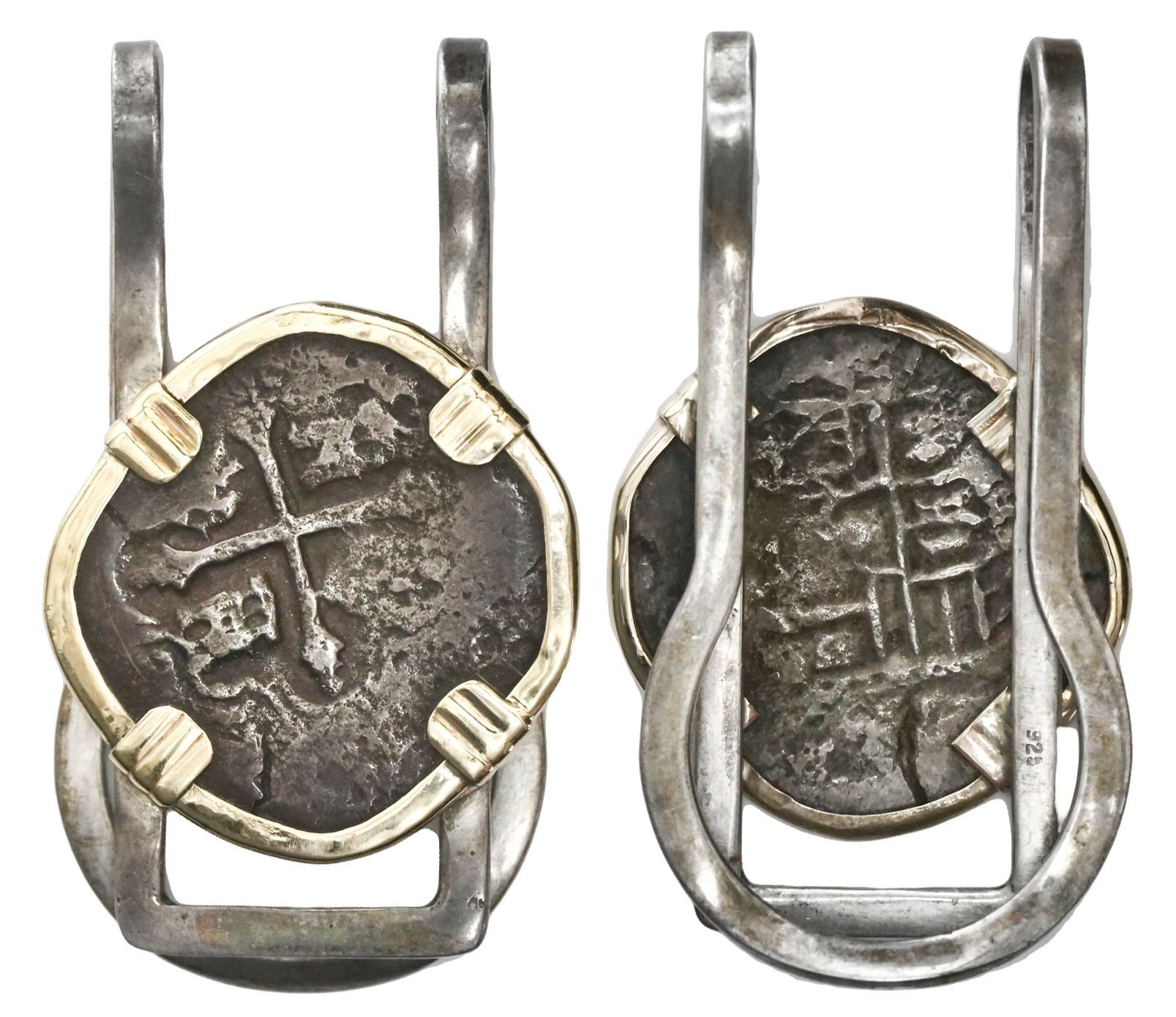 Mexico City, Mexico, cob 4 reales, Philip IV, assayer not visible, ex-Maravillas (1656), mounted cross-side out in 14K gold bezel on silver money clip. 19.12 grams total. Good full cross, nicely toned and not overly corroded, simple bent-ribbon clip. From the Maravillas (1656).
