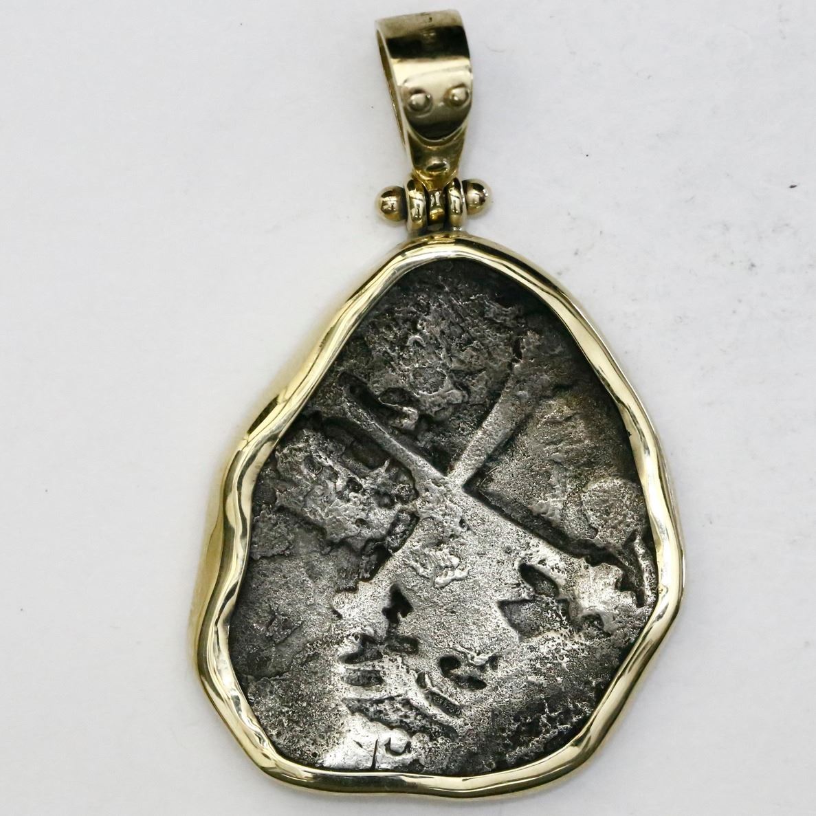 Mexico City, Mexico, cob 4 reales, Philip IV, from the Maravillas (1656), contour-mounted in 14K gold bezel with shackle bail. 17.39 grams total. Partial cross and shield, moderately corroded with darkly toned crevices, small areas of surface friction. From the Maravillas (1656).