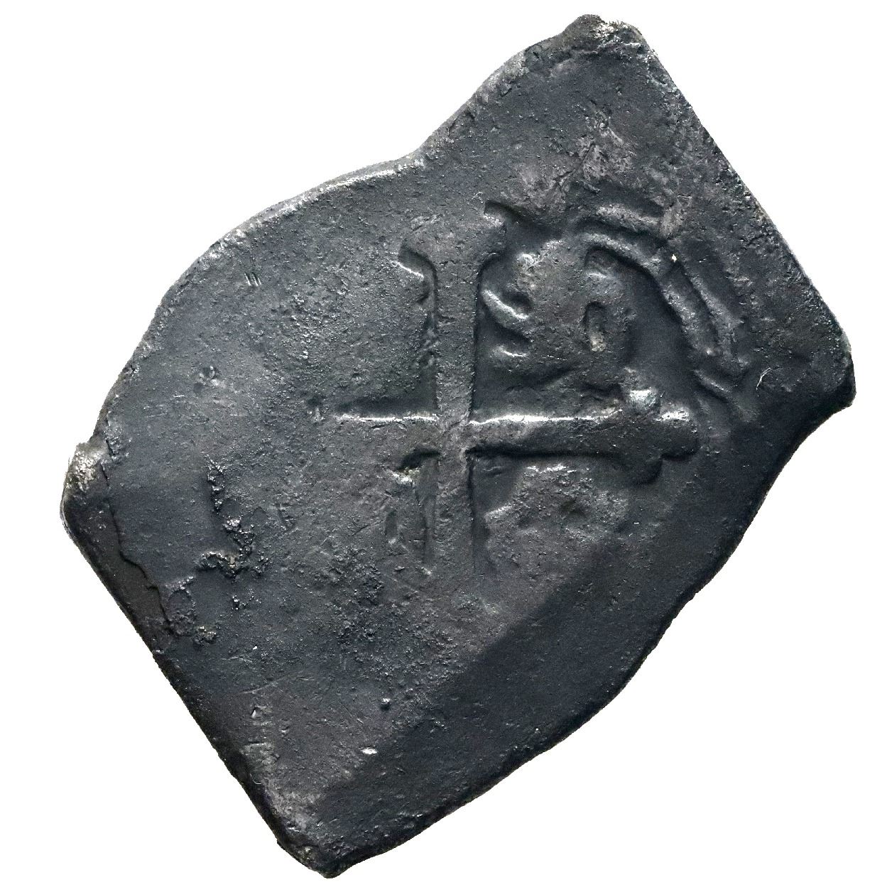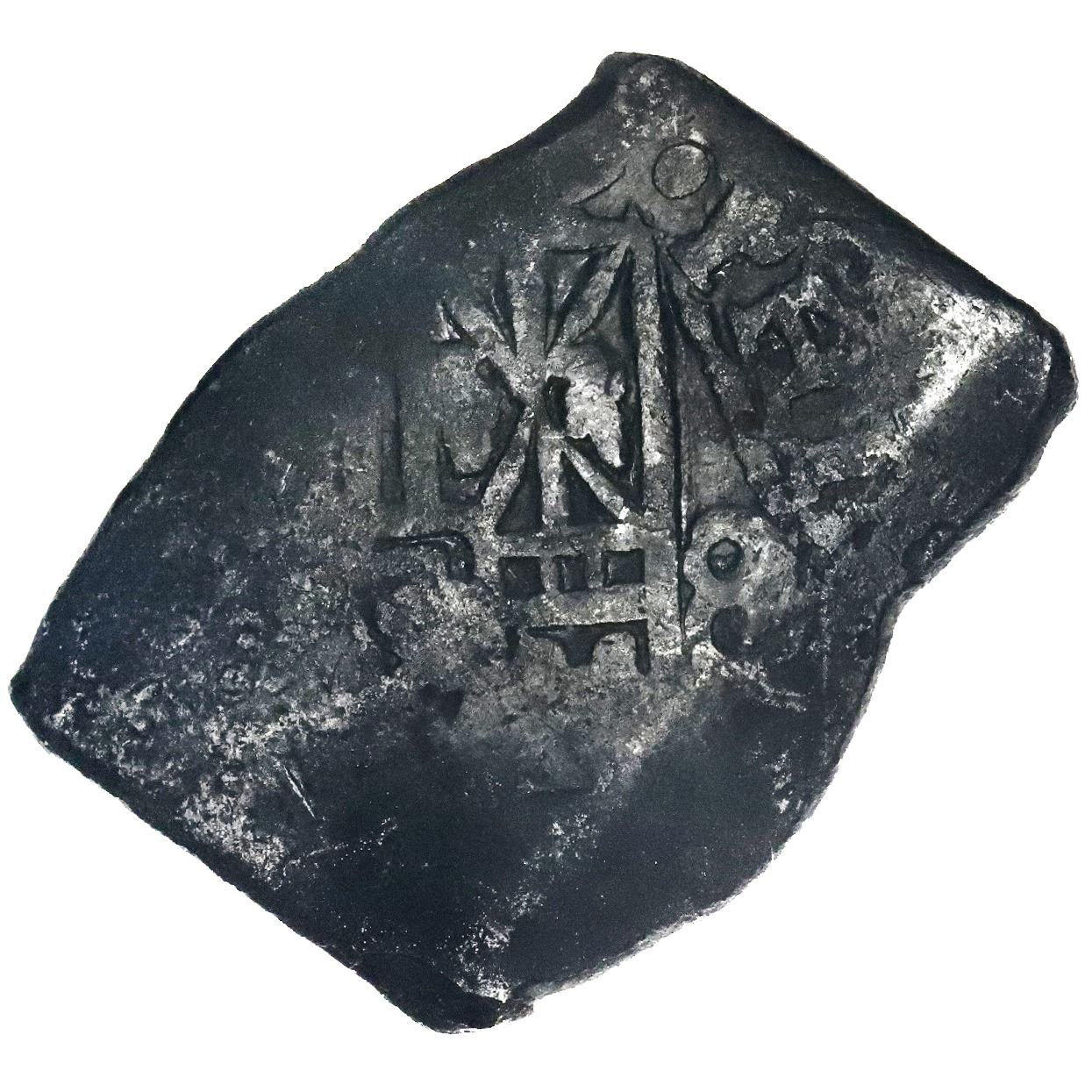 Mexico City, Mexico, cob 4 reales, Philip V, assayer not visible, denomination as 8. KM-40. 12.93 grams. Another tough error like the previous lot but with a proper-sized 4 reales obverse yet clear denomination 8, minor surface corrosion with a little horn silver and rather darkly colored, bold parts of shield and cross plus a bit of the obverse legend. From: Spanish 1715 Fleet, east coast of Florida
