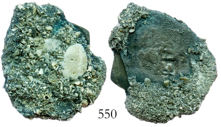 Mexico City, Mexico, cob 4 reales, Philip V, assayer not visible, encrusted. KM-40. 11.9 grams. Very thickly encrusted with white shell bits and gray debris tinged with green, middle of shield side exposed. With original Cobb Coin Co. (Fisher) tag and certificate #16599. Recovered from: 1715 Fleet, east coast of Florida