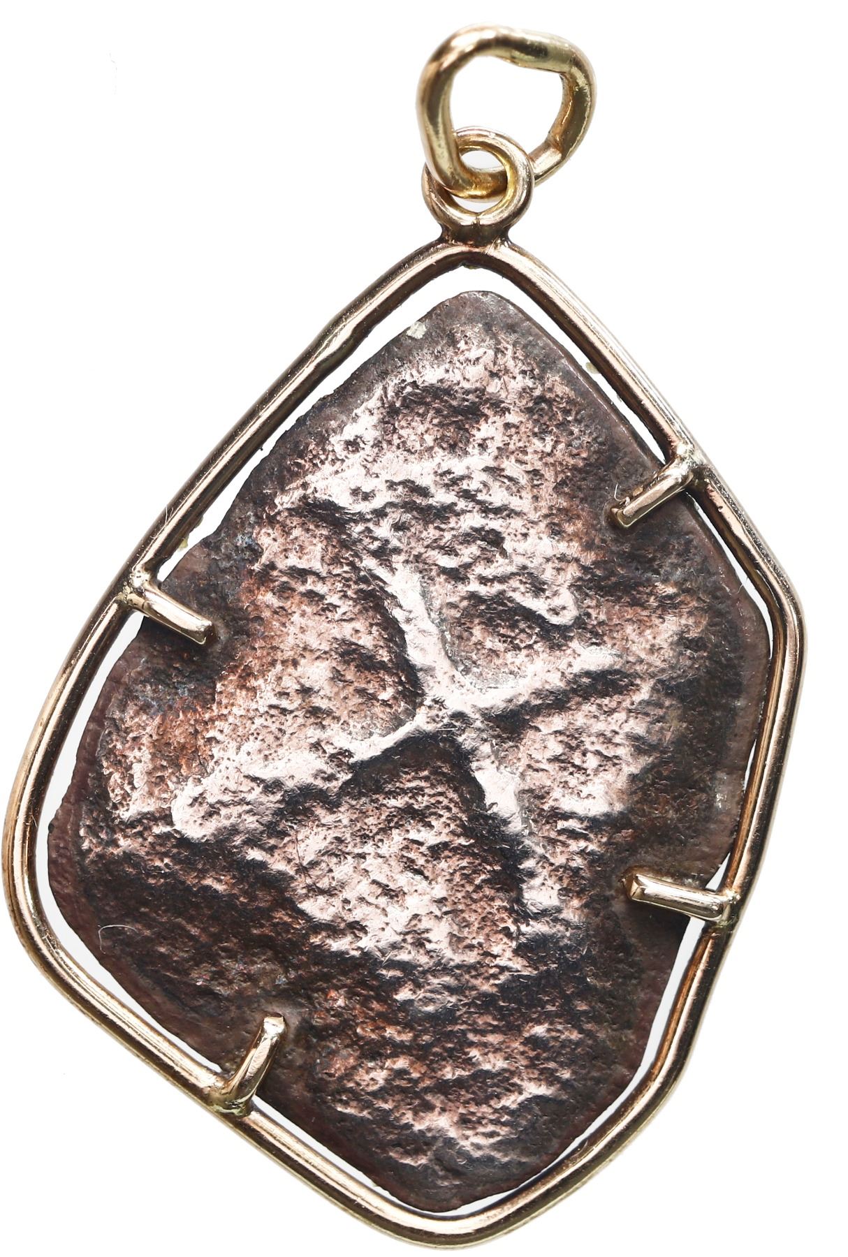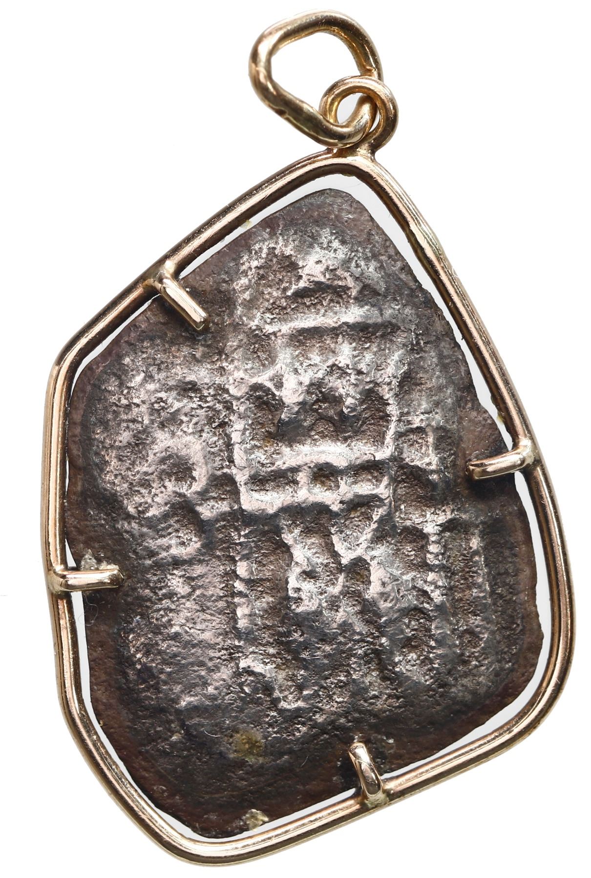 Mexico City, Mexico, cob 4 reales, Philip V, assayer not visible, error with shield side struck from 8R, mounted in thin-wire 14K gold bezel with jump-ring. 4.85 grams total. Nearly full cross and clear denomination 8 despite heavy corrosion and thinning, nicely toned, particularly near the edge where it meets the simply and somewhat aged mounting. From the 1715 Fleet, with Sedwick photo-certificate.