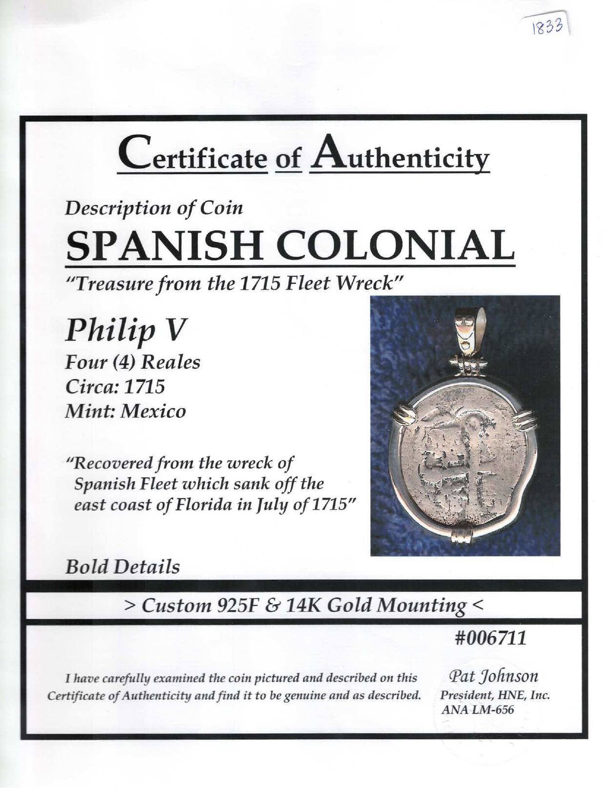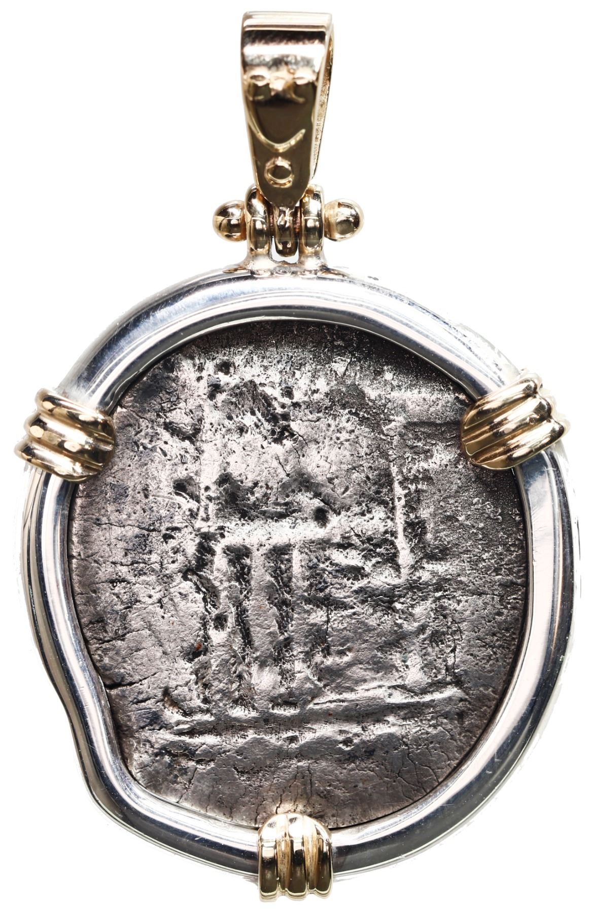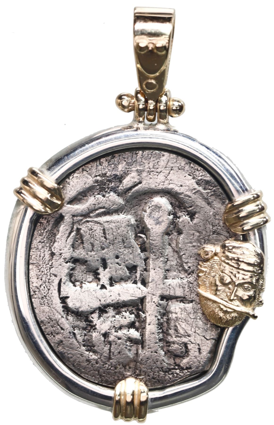 Mexico City, Mexico, cob 4 reales, Philip V, assayer not visible, ex-1715 Fleet, mounted cross-side out in thick silver bezel with 14K gold prongs, shackle bail and pirate-face embellishment. 20.27 grams total. Choice full cross and nearly full shield with light toning and practically no corrosion, mounted with cross upside-down in nearly vertical oval shape (the edge probably lightly rounded to fit). From the 1715 Fleet, with photo-certificate.