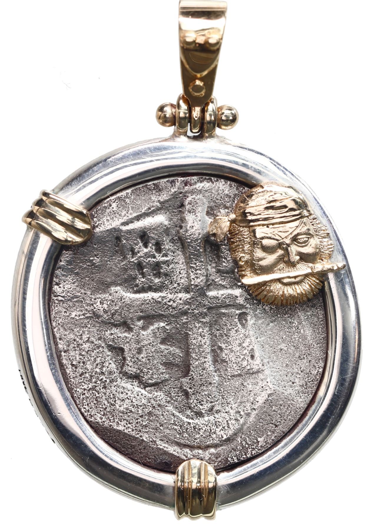 Mexico City, Mexico, cob 4 reales, Philip V, assayer not visible, ex-1715 Fleet, mounted cross-side out in very thick silver bezel with 14K gold prongs, shackle bail and pirate-face embellishment. 21.46 grams total. Solid coin with minimal surface corrosion, full cross and most of shield, mounted with cross upside-down in nearly vertical oval shape (the edge probably lightly rounded to fit). From the 1715 Fleet, with photo-certificate.