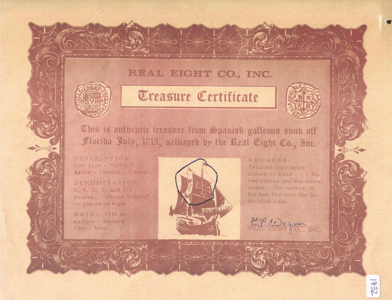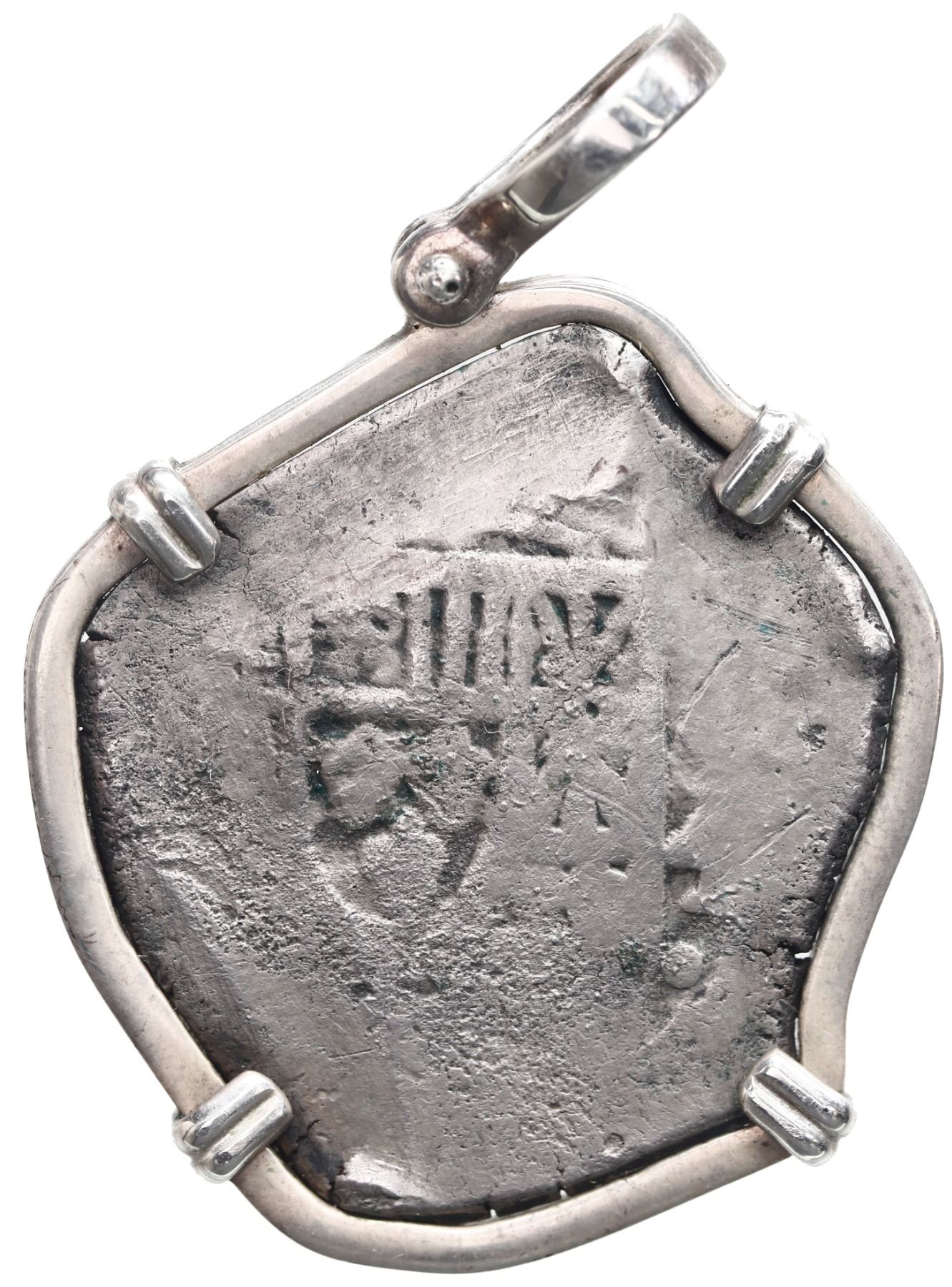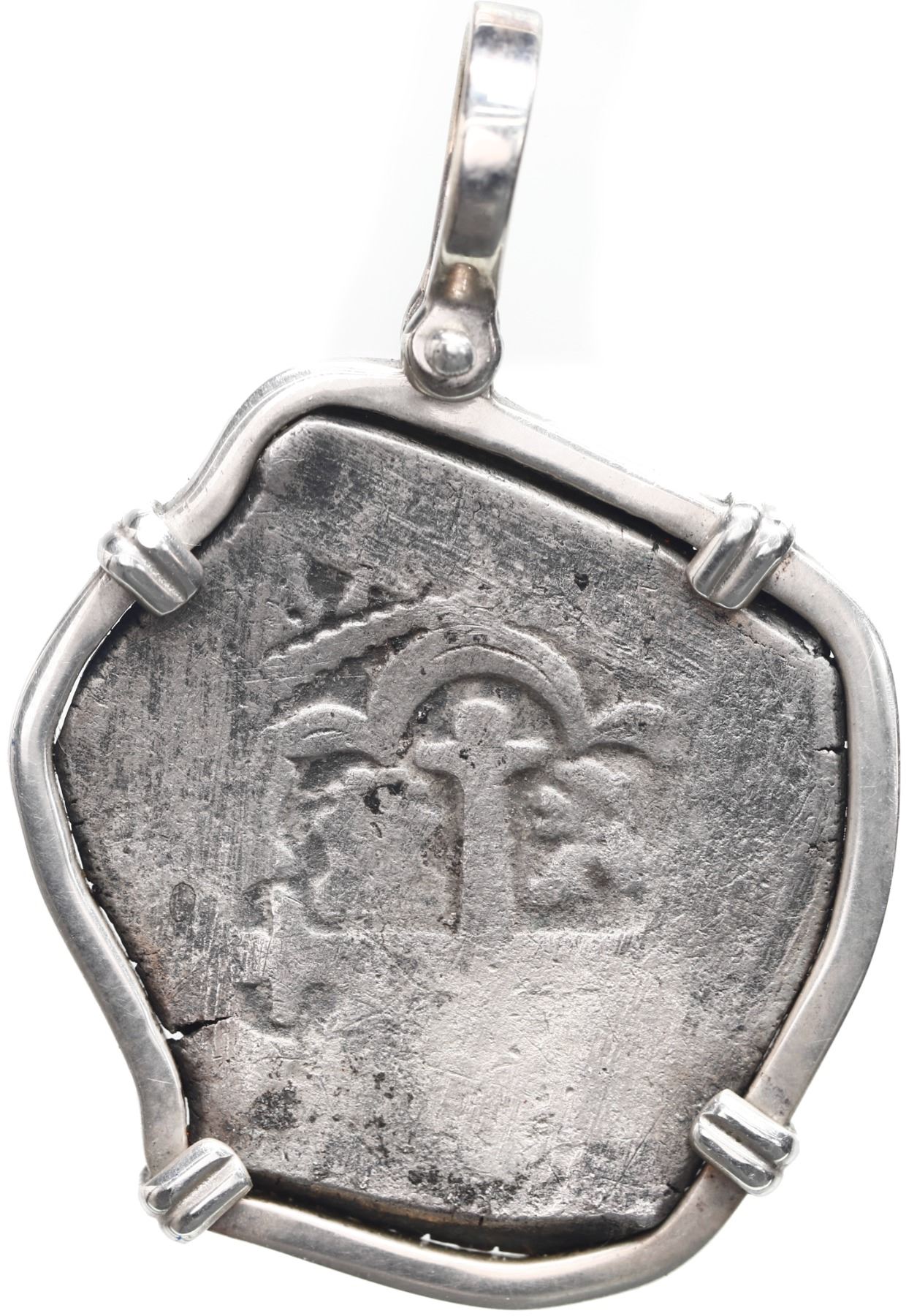 Mexico City, Mexico, cob 4 reales, Philip V, assayer not visible, ex-1715 Fleet, with original Wagner certificate, mounted cross-side out in silver bezel with shackle bail. 17.34 grams total. Mostly flat but corrosion-free and lightly toned, sturdy bezel. From the 1715 Fleet, with original (orange) Real Eight Co. certificate hand-signed by Kip Wagner.