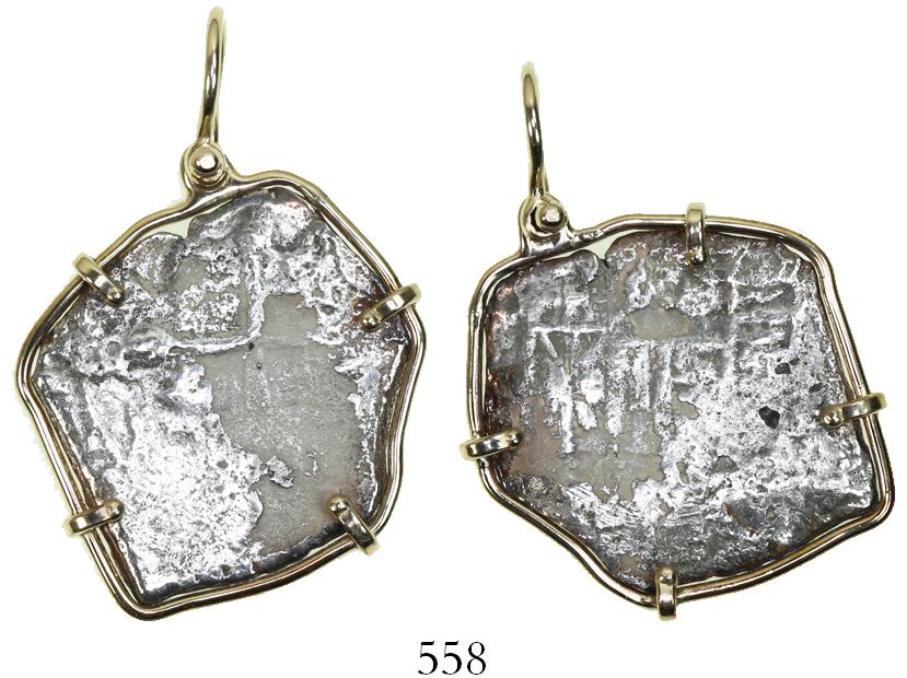 Mexico City, Mexico, cob 4 reales, Philip V, assayer not visible, mounted in 14K gold pendant-bezel. KM-40. 13.01 grams total. Moderately corroded coin with only partial cross and shield, thin-wire mounting with shackle bale. With Cobb Coin Co. certificate #243804 hand-signed by Mel Fisher in red ink and with Budde-Jones booklet initialed by Mel as well. Recovered from: Spanish 1715 Fleet, east coast of Florida