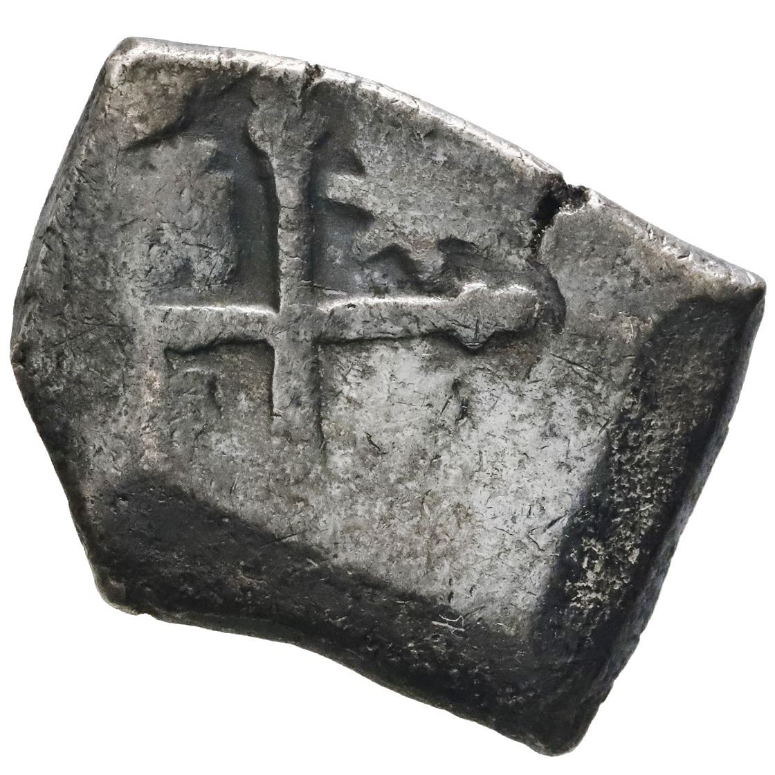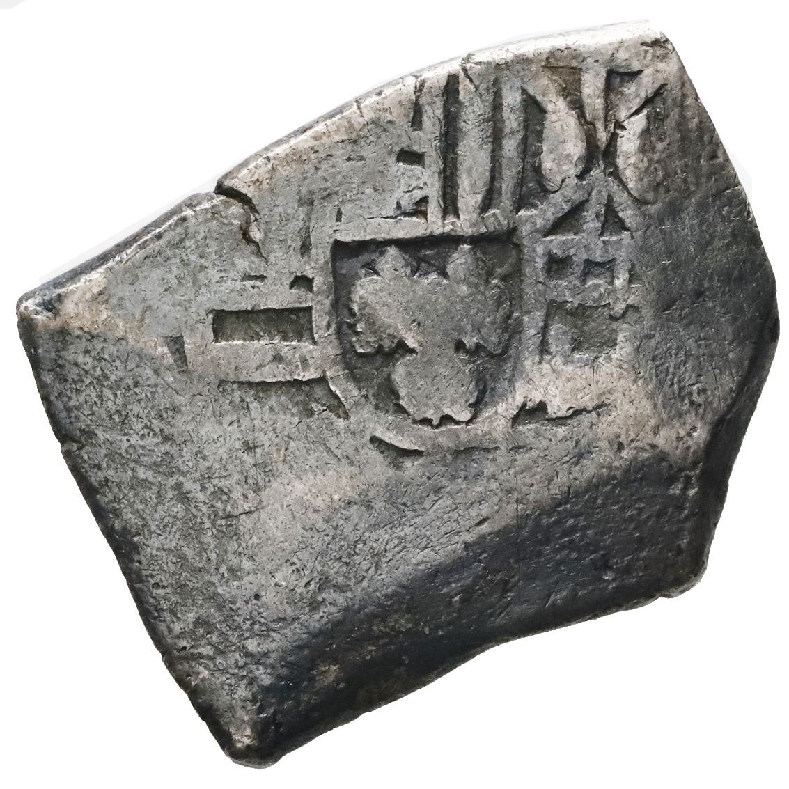 Mexico City, Mexico, cob 4 reales, Philip V, assayer not visible, shield side struck from 8R die, with hand-signed Cannon certificate. KM-40. 12.98 grams. Solid coin with minimal corrosion, bold partial large size shield from an 8-reales obverse die (scarce error), some cross detail, darkly toned surfaces, desirable certificate. With original Real Eight Co. certificate (undated, early 1970s) hand-signed by Harry Cannon. From: Spanish 1715 Fleet, east coast of Florida