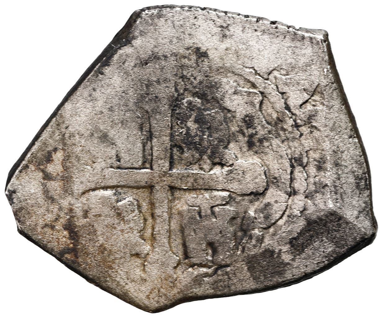 Mexico City, Mexico, cob 4 reales, Philip V, assayer not visible. KM-40. 13.50 grams. Choice, high-grade details with sharp edges, most of shield and cross visible, spotty toning all over. Pedigreed to the J.P. Silberman Estate. Recovered from: Spanish 1715 Fleet, east coast of Florida.