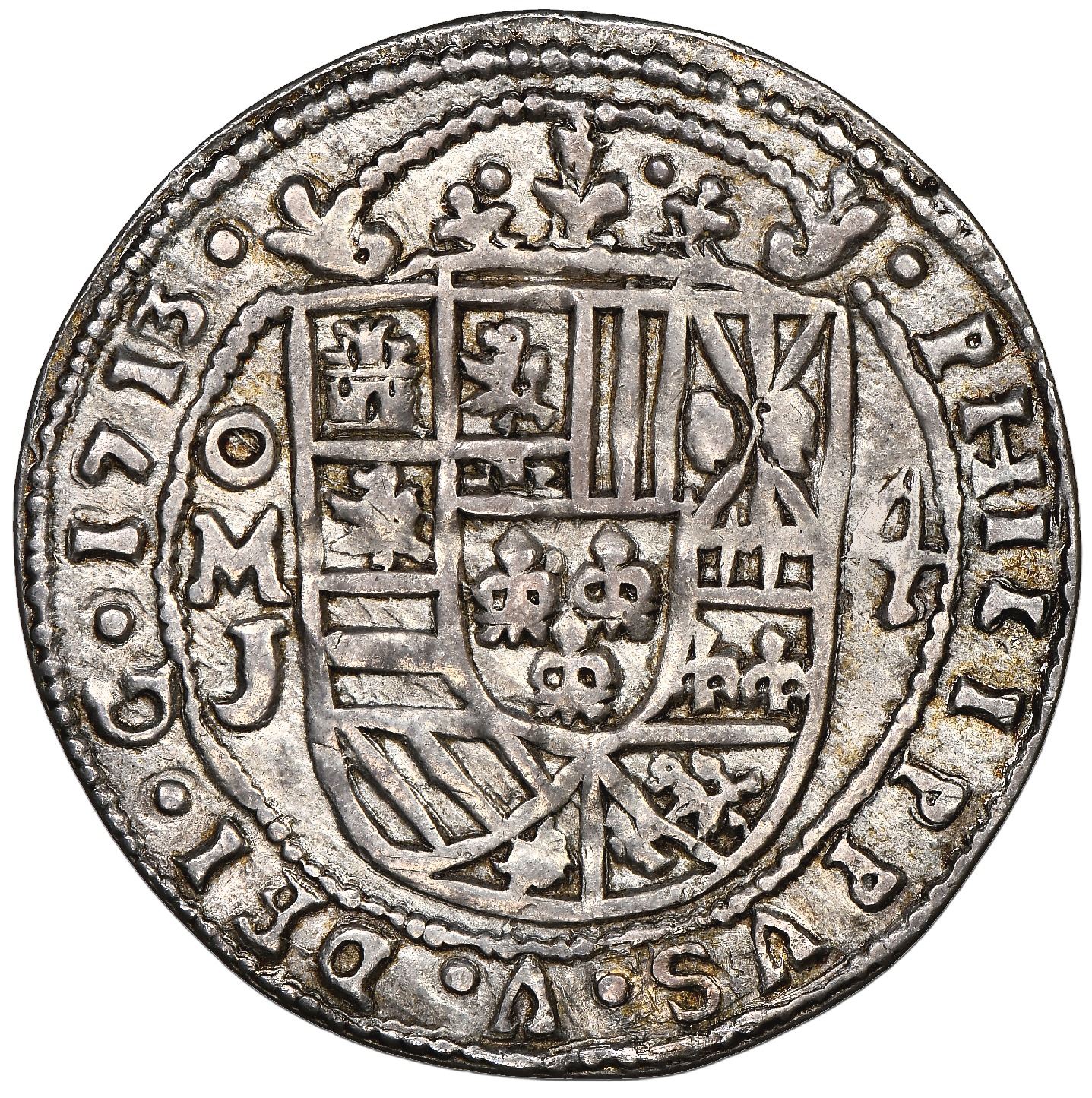 Mexico City, Mexico, cob 4 reales Royal (galano), 1713J, unique, NGC XF details / plugged, finest and only example in NGC census. S-M22; KM-unl; Cal-unl. 13.47 grams. In stark contrast to the regular production issues, this Royal is perfectly evenly struck on a broad flan with no doubling or weakness anywhere, beautifully toned and lacking any significant marks or wear (relatively high grade) except for an expertly repaired hole at the bottom (medal-aligned axis), as is customary for Royals. This is the final date of a generally heavy-handed style (those of 1714 and especially 1715 onward having very sharp and crisp details instead), giving it a charmingly old and rustic look that appeals particularly to cob collectors, although this unique piece would certainly be a highlight in any collection of Mexican rarities or general world-coin trophies. NGC #2789252-017. Pedigreed to the Isaac Rudman Numismatic Cabinet.