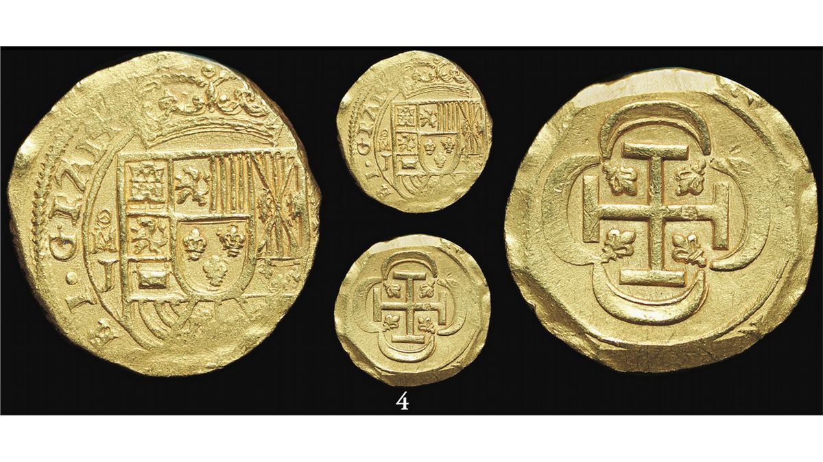 Mexico City, Mexico, cob 8 escudos, 1714/GRAT, assayer J, rare, from the 1715 Fleet. S-M30; KM-57.2. 26.8 grams. Full and bold date with clear over-punching, full and well-centered cross, off-center shield with full crown above and bold oMJ to left, UNC, nicely oval flan. From the 1715 Fleet.