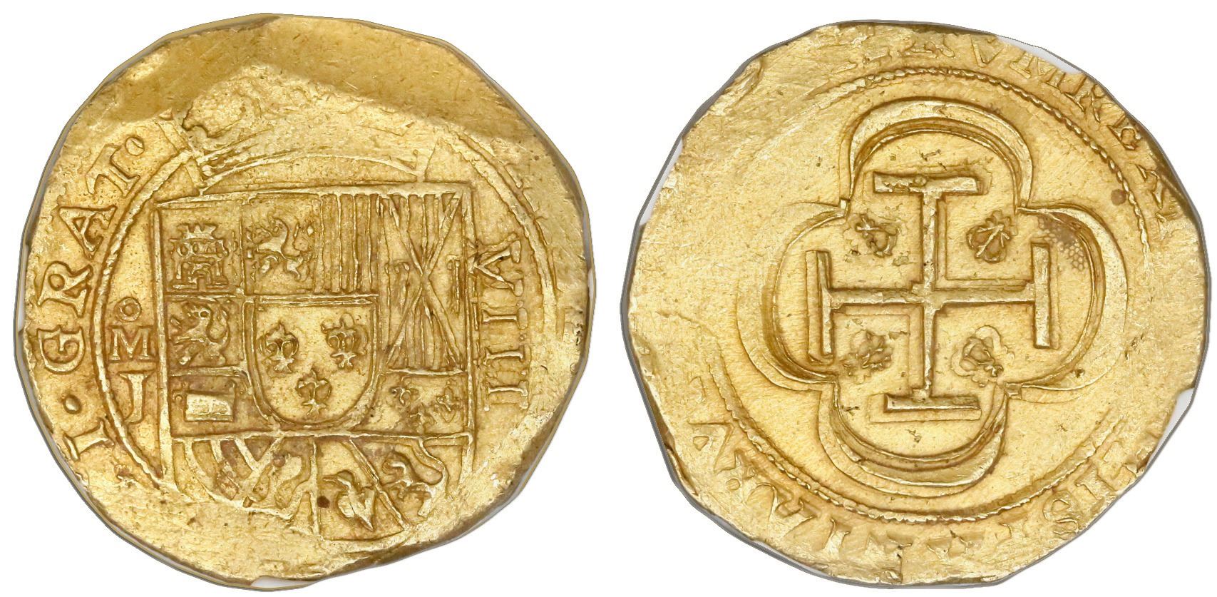 Mexico City, Mexico, cob 8 escudos, (1714)J, "GRAT" variety, NGC MS 64, ex-1715 Fleet (designated on label). S-M30; KM-57.2; CT-107. 26.99 grams. Round flan of nearly uniform thickness with just a couple small bevels on edge, choice full shield and cross (both finely detailed, with faint light doubling), bold full "GRAT" where date normally appears, hints of toning in crevices, rich gold color, tied with one other for second finest at NGC for this variety (this being the only one without visible date). From the 1715 Fleet. NGC #4484639-002.