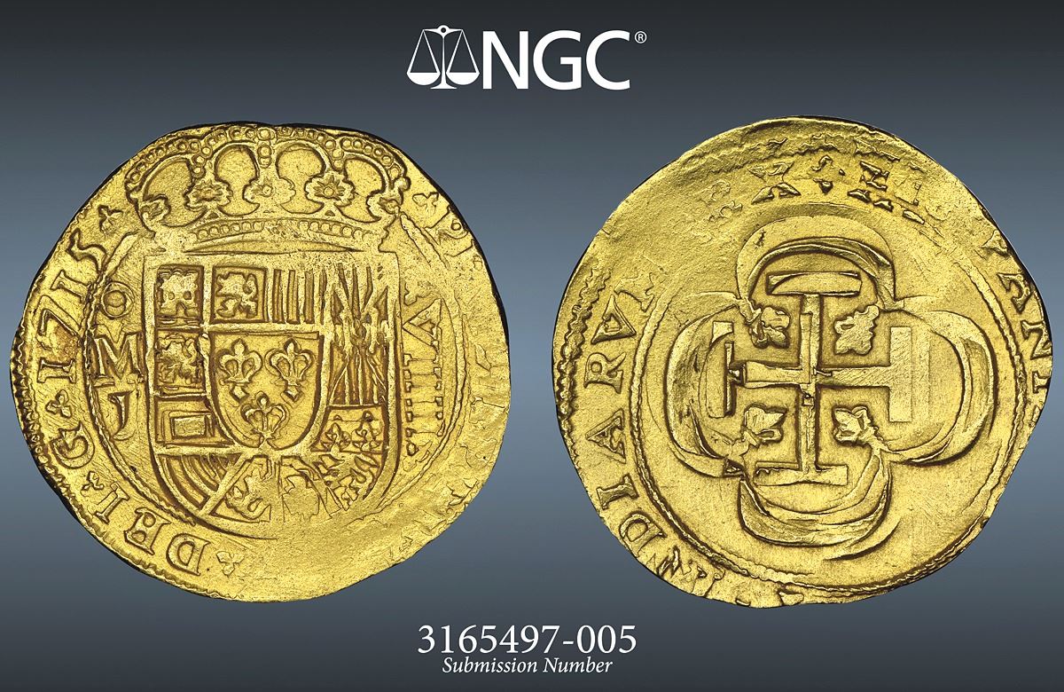 Mexico City, Mexico, cob 8 escudos, 1715J, special planchet and strike, NGC MS 64, ex-1715 Fleet (designated on label), finest graded by NGC, ex-Real Eight (Schulman, 1972), Lopez-Chaves and Yriarte Plate Coin. S-M30; KM-57.2; CT-109. 26.93 grams. While the concept of round presentation coins from the Spanish colonial mints was of course known, credit for calling them "Royals" in the sense of being made for the king has generally gone to the New York auction house of Schulman and the offering of the Real Eight Company's finds from the 1715 Fleet, which included several gold Royals in a handful of auctions. Case in point is the present specimen, which was advertised in the 1972 Schulman catalog as "Philip's Own 1715 'Royal'," with lot description as follows: "Magnificent 8 Escudos 1715 oMJ. Value is written VIIIIII. Fully struck round, on a somewhat concave planchet, therefore part of the planchet did not reach the diestamp... No 1715 round perfect 8 Escudos ever on the market. Gem Abt. Unc. Reserve on this coin is $7,000." The Schulman estimate was $14,000-$17,500, and the hammer price was $7,000 (the equivalent buying power of about $42,000 today). In the same sale, a 1702 8E Royal received a headline (caps in original) of "A COIN NOT STRUCK FOR THE PUBLIC, BUT FOR THE KING ONLY," followed by another 1702 piece with the notation "It is not strange that a few ROYALS of the same date are found as it was assumed the King desired more than one of such pieces." While obviously over the top, all this bombast has had a single ring of truth through the years: Gold Royals are exceedingly rare and valuable. For this specific piece, however, there is an important modification: This is not a Royal! True Royal 8E of the date 1715 were subsequently found on the 1715 Fleet, showing fully struck details on perfectly round flans and--most important--with a different reverse that shows "daggers" in the dimples of the tressure (same as for the 1714 Royals), which the present specimen clearly does not have. It is nevertheless much rounder and more complete than practically all of the "non-Royal" 1715 8E known, and to our knowledge it is the finest known graded by NGC, with choice full shield and crown, date, oMJ and denomination (the last-mentioned item indeed slightly doubled to appear as "VIIIIII" like Schulman noted), yet with incomplete legends and some doubling and flatness on the reverse (the cross-and-tressure still complete and well centered). In sum, this is a special coin--not a Royal, but still special--and surely had some reason to be unlike every other "normal" cob... we just don't know the reason. From the 1715 Fleet, pedigreed to the Real Eight Co. offering in the Schulman (New York) auction of November 1972 (lot #557), and Plate Coin #284 on page 24 of Catalogo General de la Onza (1968), by Leopoldo Lopez-Chaves and Jose de Yriarte. NGC #3165497-005.