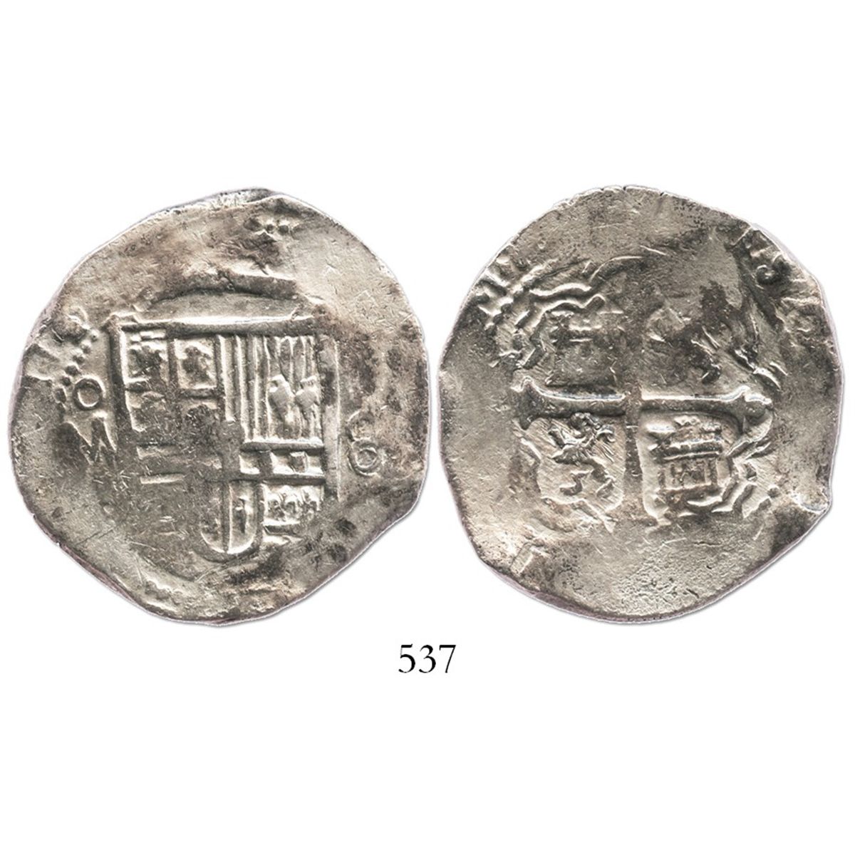 Mexico City, Mexico, cob 8 reales, (1)614/3(F), very rare. S-M17; KM-unl (44.3); CT-unl. 26.8 grams. Bold 14/3 of date (only specimen we know of), full oM and denomination 8 flanking full shield, decent full cross, solid VF with patchy toning. Pedigreed to the Ponterio auction of 9/05, lot 414.