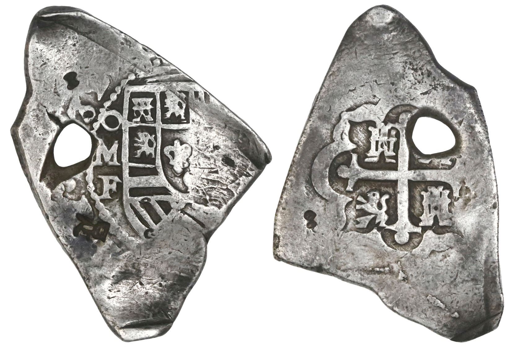 Mexico City, Mexico, cob 8 reales, 1(7)32F, with chopmarks as from circulation in Asia. S-M26; KM-47a; CT-764. 26.99 grams. Odd triangular shape with natural bubble-hole, blunted points, full 32 of date and very bold full oMF, choice details in partial shield and full cross, choice VF with one large and a few tiny chops.