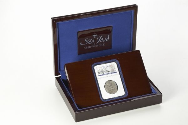 Mexico City, Mexico, cob 8 reales, (16)09A, Grade 2, rare. S-M16; KM-44.3; CT-90. Very bold 9 of date and full and clear assayer A, full but partially weak shield, the cross also full but moderately corroded, no toning. Encapsulated by NGC and with Arqueonautas certificate #1974063010, with wooden presentation box. From the Sao Jose, sunk in 1622 off Mozambique, east of Africa