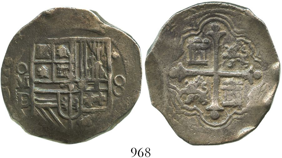 Mexico City, Mexico, cob 8 reales, 16(1)8/7D/F, rare. S-M18; KM-unl. 27.2 grams. Nice round flan with bold full oMD/F and denomination 8, choice full shield and cross, weak but certain date, well-toned VF+.