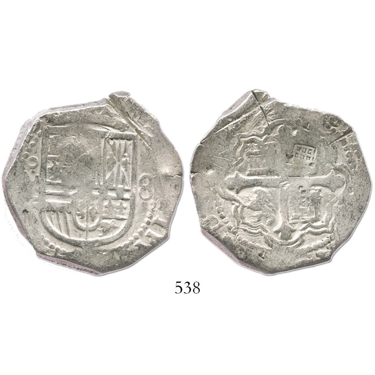 Mexico City, Mexico, cob 8 reales, (16)19F, very rare (unlisted), with chopmarks and test-cuts as from circulation in the Orient. KM-unl (44.3); CT-unl. 27.4 grams. Clear bottom of 19 of date and certain oMF (unlisted date for this assayer), bold denomination 8, full but somewhat weak shield and cross-and-tressure, silvery Fine with an interesting variety of chops.