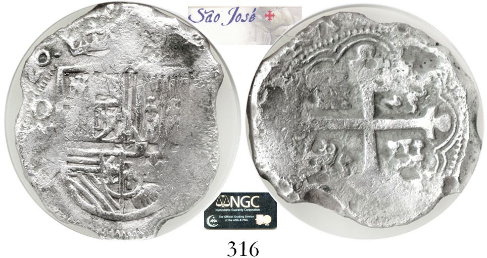 Mexico City, Mexico, cob 8 reales, (16)20D, Grade 1. S-M18; KM-44.3; CT-117. Bold date, good full shield and cross, crude peripheries (flatness and corrosion). Encapsulated by NGC and with Arqueonautas certificate #1973524047, with wooden presentation box. From the Sao Jose, sunk in 1622 off Mozambique, east of Africa
