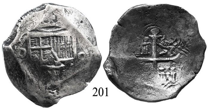 Mexico City, Mexico, cob 8 reales, (16)24(D). S-M18a. 26.7 grams. Very thick and solid flan, with bottom half of 24 of date (rare), most of cross and shield and crown, no corrosion but typically crude planchet (very uneven thickness and peripheral flatness), lightly toned. Recovered from: "Lucayan Beach wreck," sunk ca. 1628 off Grand Bahama Island.