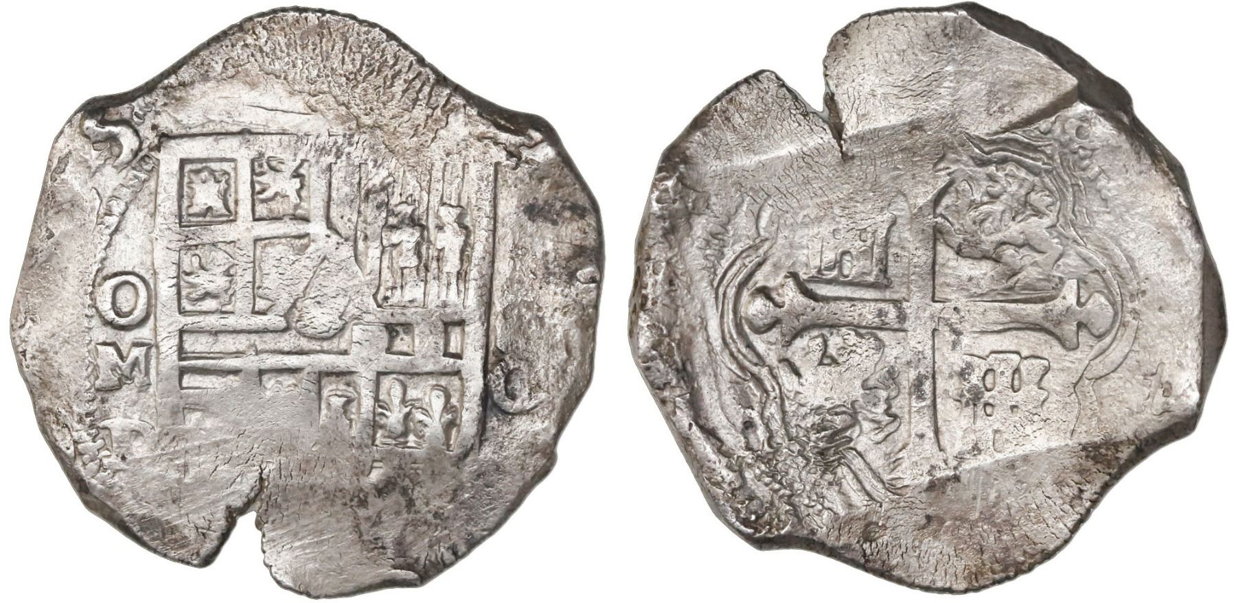 Mexico City, Mexico, cob 8 reales, (16)25/4D. S-M18a; KM-45; CT-316. 26.68 grams. Roundish (concave) flan with edge-split, good full shield and cross, bold oM and 5/4 of date, AXF with some luster but flat areas as well. Pedigreed to the Ponterio auction of November 2007, with original lot-tag #627.