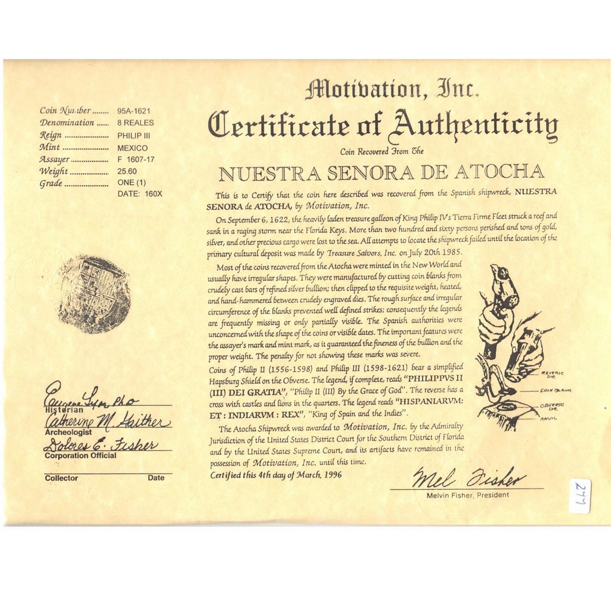 Mexico City, Mexico, cob 8 reales, 1607F (possibly date over GRATIA), rare, Grade 1. S-M15; KM-44.3; CT-91. 25.73 grams. Choice full shield and cross and oMF, bottom half of date bold with hints of letters underneath, solid but with some surface pitting, nicely toned on fields. With Fisher certificate #95A-1621 and copy of Coins of the Lost Galleons booklet by Budde-Jones (2nd ed., 1993). Recovered from: Atocha, sunk in 1622 west of Key West, Florida