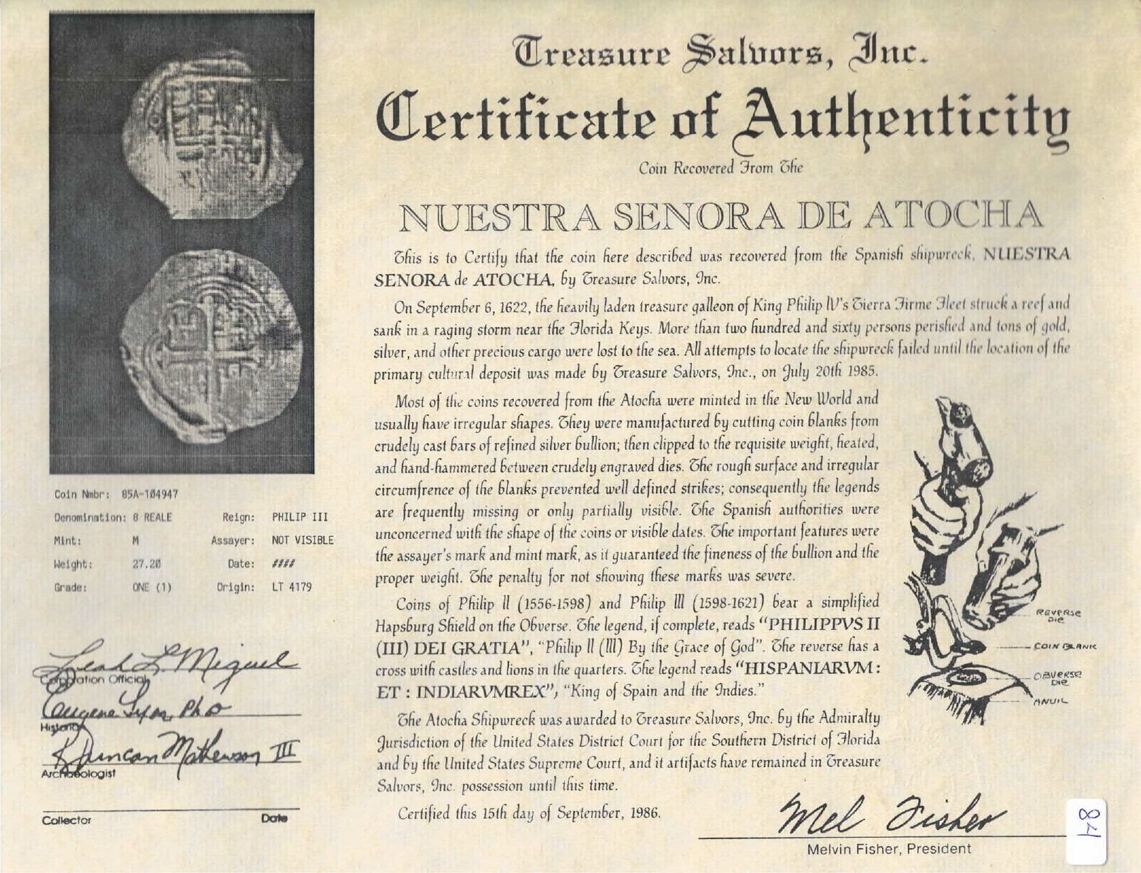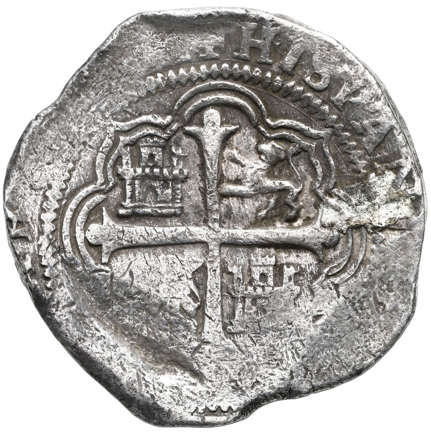 Mexico City, Mexico, cob 8 reales, 1609/8/7 A/F, rare, Grade 1. S-M16; KM-unl; Cal-unl. 27.06 grams. Superb specimen with no corrosion at all and actually nicely toned, the shield and cross-lions-castles both fully detailed and with full mintmark and clear date (the 9/8/7 understandably messy but 100% certain), also with just enough of the assayer A to confirm, neat patch of coral to right of cross. With Fisher tag and certificate 85A-104947. From: Atocha, sunk in 1622 west of Key West, Florida