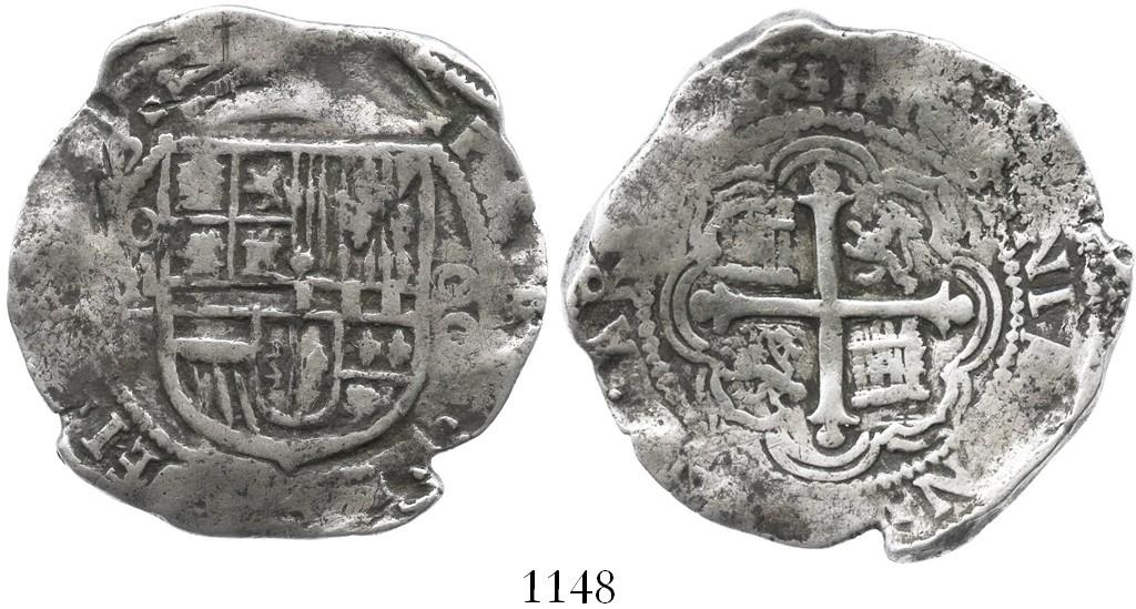 Mexico City, Mexico, cob 8 reales, (161)3F. S-M17; KM-44.3; CT-94. 27.1 grams. Very bold and choice full shield and cross, most of 3 of date and oM mintmark, some peripheral crudeness (as made), AVF with contrasting toning.