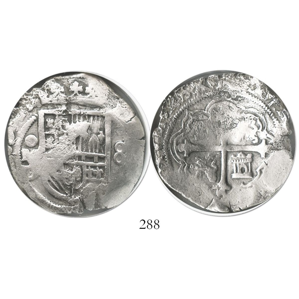 Mexico City, Mexico, cob 8 reales, 1619/8D/F, Grade 1. S-M18; KM-unl (44.3); CT-unl. Very bold full shield and denomination 8, nearly full cross, much legend, some flatness and corrosion, contrasting toning in crevices. Encapsulated by NGC and with Arqueonautas certificate #1973341019, with wooden presentation box. Recovered from: Sao Jose, sunk in 1622 off Mozambique