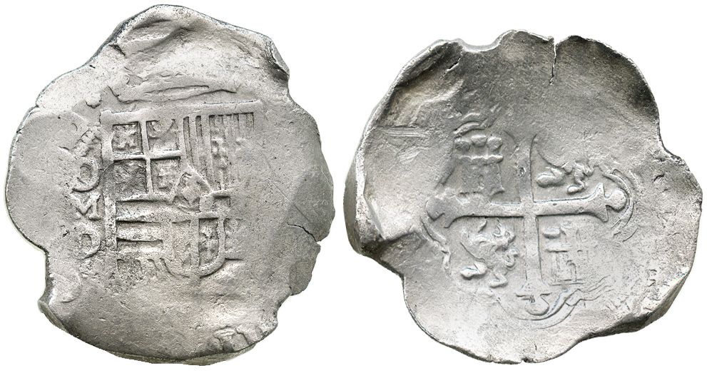 Mexico City, Mexico, cob 8 reales, (162)2/1/0D. S-M18a; KM-45; CT-309. 25.1 grams. Somewhat barrel-shaped flan of extremely uneven thickness (looks like the metal was too soft), with nice full shield and cross, bold oMD, faint but certain date, VF+ with peripheral flatness. Probably from the "Lucayan Beach wreck" (ca. 1628).