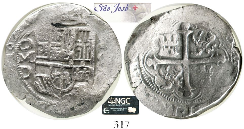 Mexico City, Mexico, cob 8 reales, 1620D, Grade 1. S-M18; KM-44.3; CT-117. Spectacular full cross, good full shield, bold oMD, nearly full date, solid and corrosion-free. Encapsulated by NGC and with Arqueonautas certificate #1974063001, with wooden presentation box. From the Sao Jose, sunk in 1622 off Mozambique, east of Africa