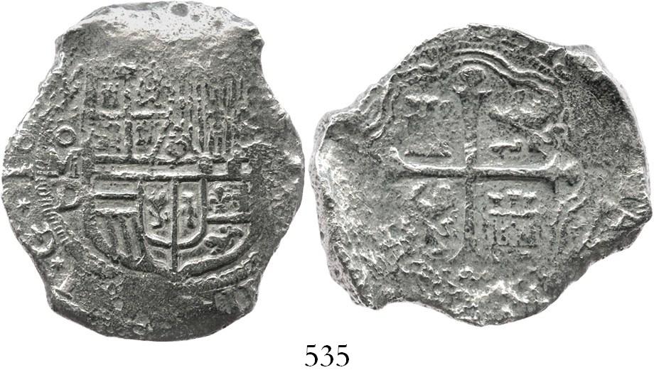 Mexico City, Mexico, cob 8 reales, 1622D, Grade 1, rare. S-M18a; KM-45; CT-unl. (Type 94). 23.7 grams. Classic barrel-shaped flan with choice full shield and cross, clear date (very desirable as the date of the wreck), bold oMD, light corrosion only and typically silvery. With original Fisher certificate #183567. From: Atocha, sunk in 1622 west of Key West, Florida
