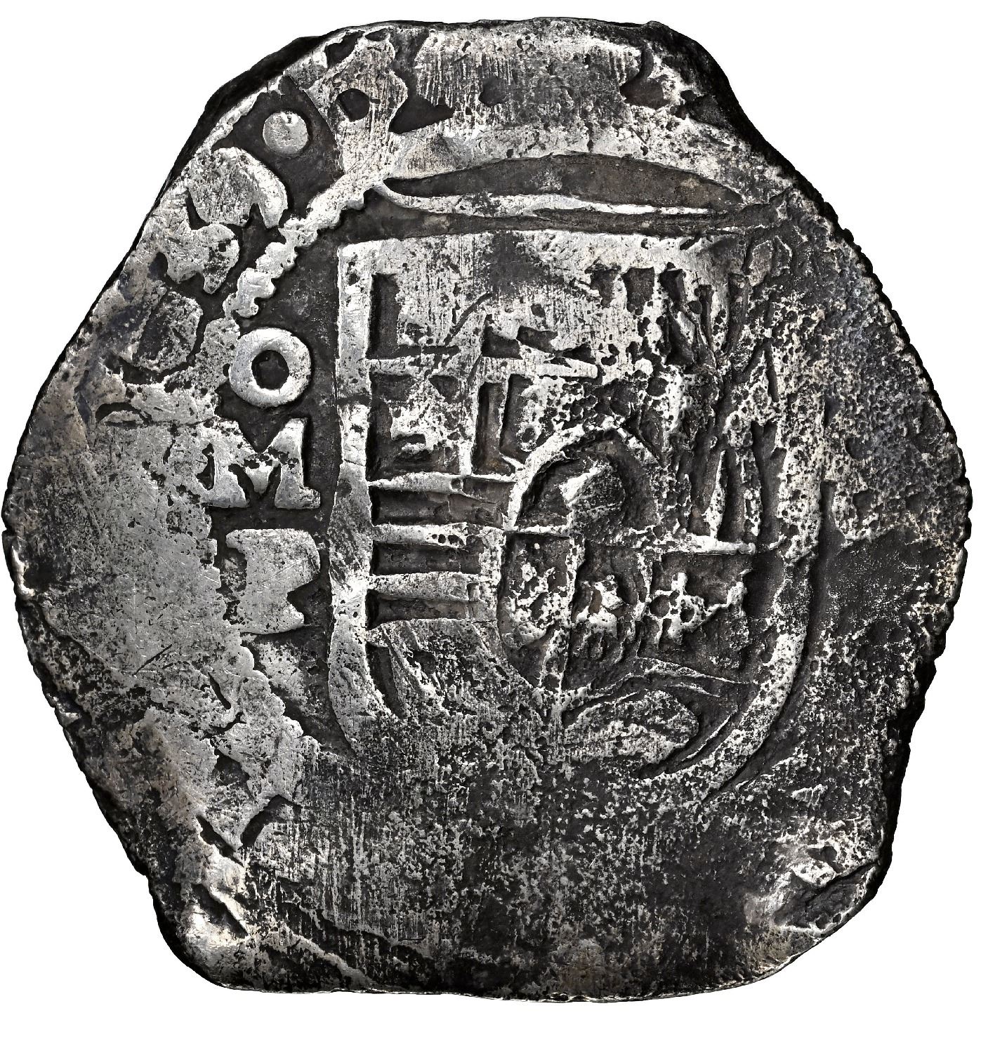 Mexico City, Mexico, cob 8 reales, 1639 P, NGC VF details / saltwater damage / Concepcion (Shipwreck Blue Label). S-M19; KM-45; Cal-1328. 24.80 grams. Very broad flan with full cross and shield, clear date with full 39, bold full oMP, some flatness and surface corrosion but nicely toned. Pedigreed to the 45th Anniversary Collection, with original tag 035 and official (generic) Letter of Authenticity. Recovered from: Concepcion, sunk in 1641 off Hispaniola