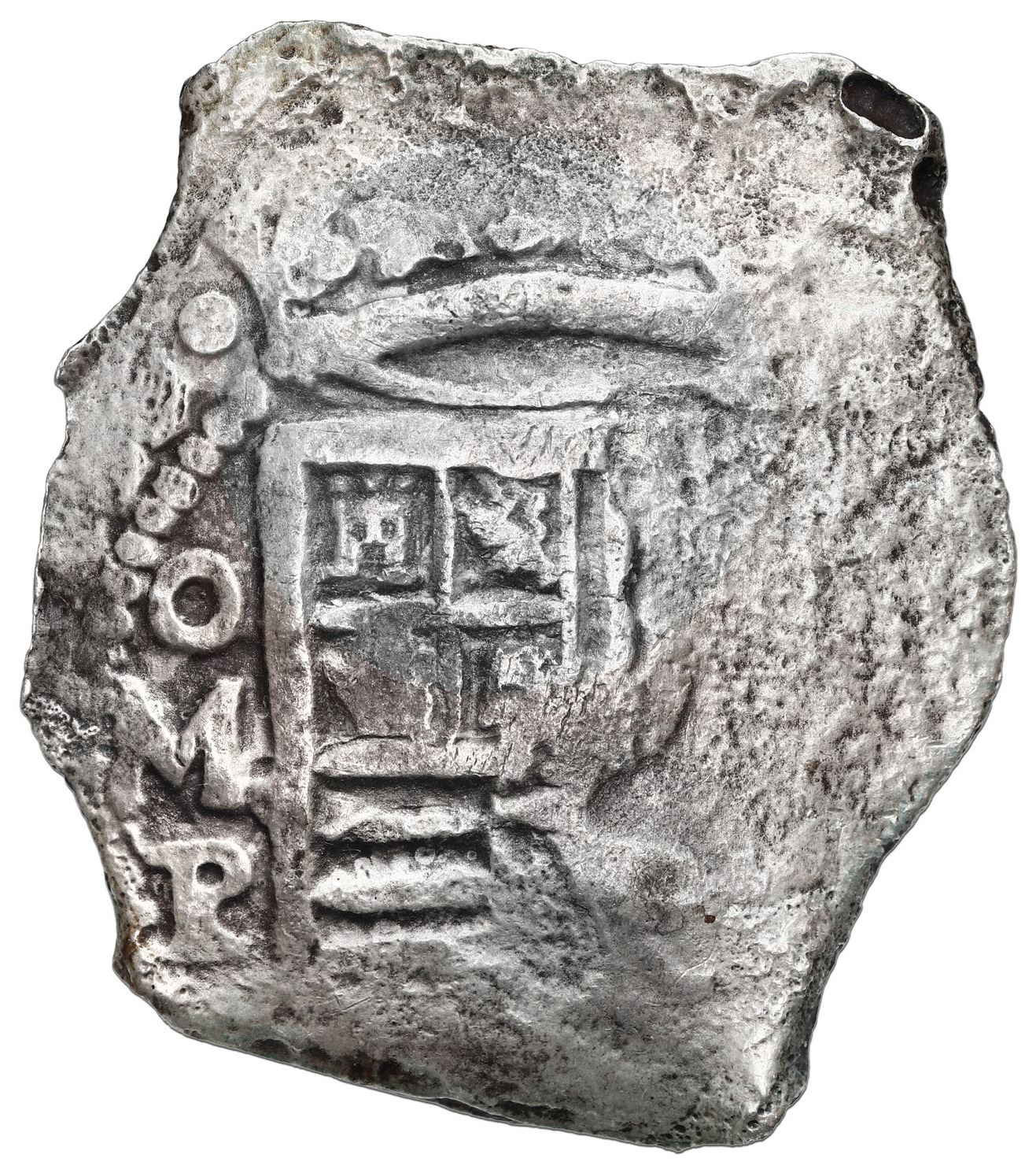 Mexico City, Mexico, cob 8 reales, 1639 P. S-M19; KM-45; Cal-1328. 17.58 grams. Thin from corrosion but with bold full oMP, about half of shield and crown and cross visible among flatness, just the bottoms of 39 date visible (not 100% certain), some light toning. With certificate and tag 115002. From: Concepcion, sunk in 1641 off Hispaniola