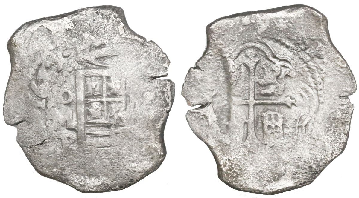 Mexico City, Mexico, cob 8 reales, 1639P. S-M19; KM-45; CT-334. 23.93 grams. Salvaged AU (silvery from cleaning) with full date and oMP, most of cross, lots of flatness and surface corrosion, small edge-splits.