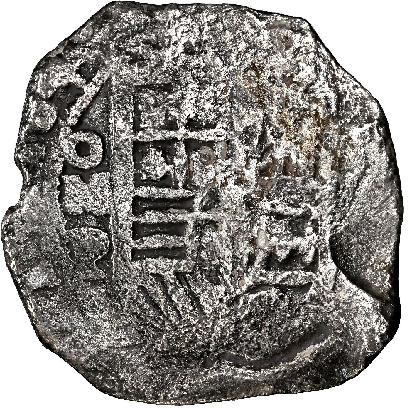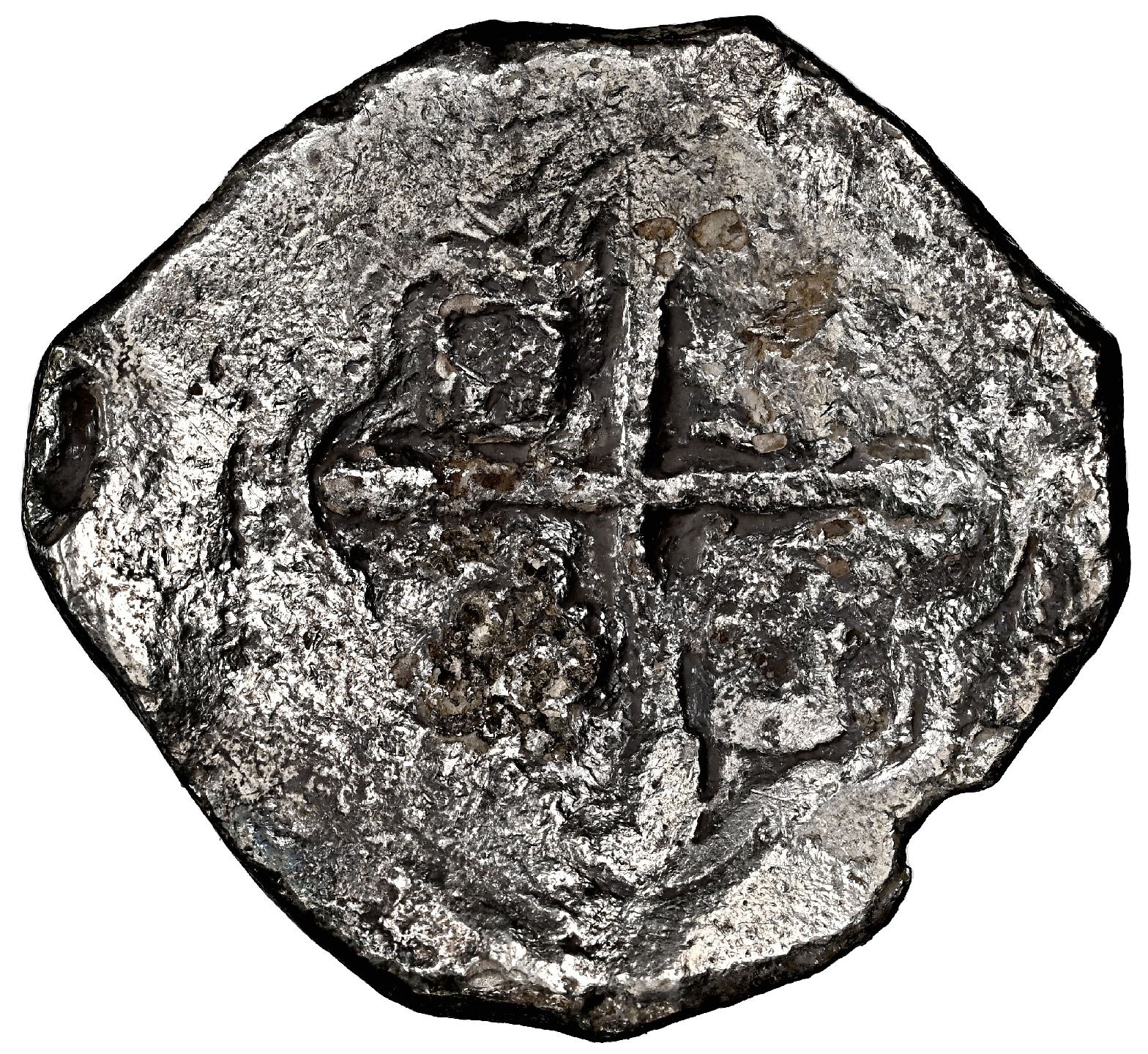 Mexico City, Mexico, cob 8 reales, 164(?) P, NGC Fine details / saltwater damage / Concepcion (Shipwreck Blue Label). S-M19; KM-45. 24.54 grams. Decent full cross and shield despite moderate surface corrosion (also nicely toned), full oMP and clear 164 of date. Pedigreed to the 45th Anniversary Collection, with original tag 26493 and official (generic) Letter of Authenticity. Recovered from: Concepcion, sunk in 1641 off Hispaniola