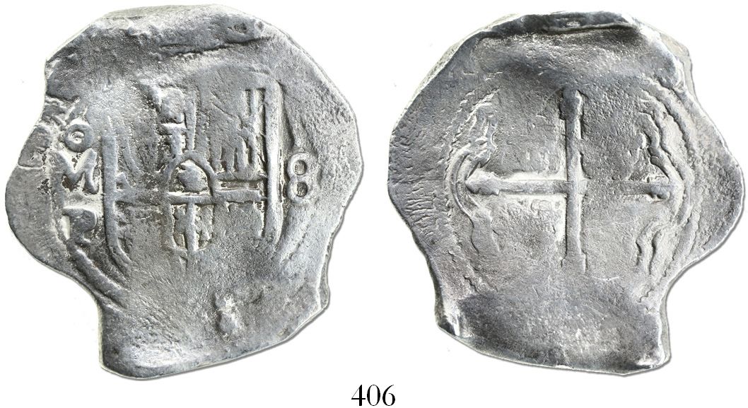 Mexico City, Mexico, cob 8 reales, 1640/39P. S-M19; KM-45; CT-335. 26.01 grams. Very broad flan (typical shape, uneven thickness, much flatness), bold oMP and denomination, no corrosion. With certificate. Recovered from: Concepcion, sunk in 1641 off Hispaniola