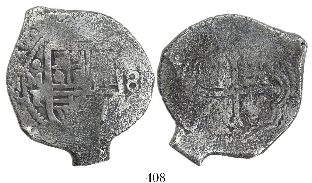 Mexico City, Mexico, cob 8 reales, 1640P. S-M19; KM-45; CT-336. 26.16 grams. Interesting pomegranate-shaped flan, with clear oMP and denomination, most of date (possibly 40/39), very light surface corrosion only. With certificate. Recovered from: Concepcion, sunk in 1641 off Hispaniola