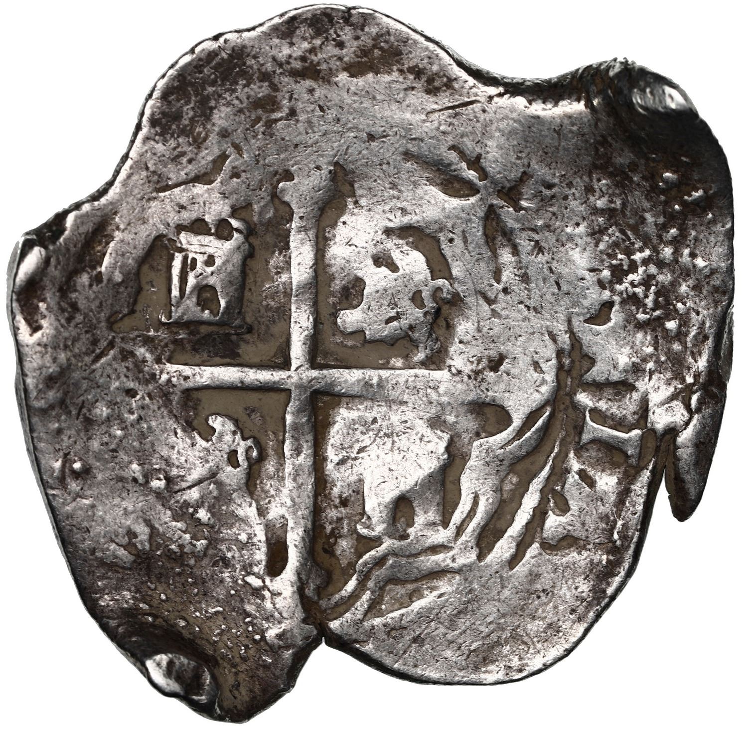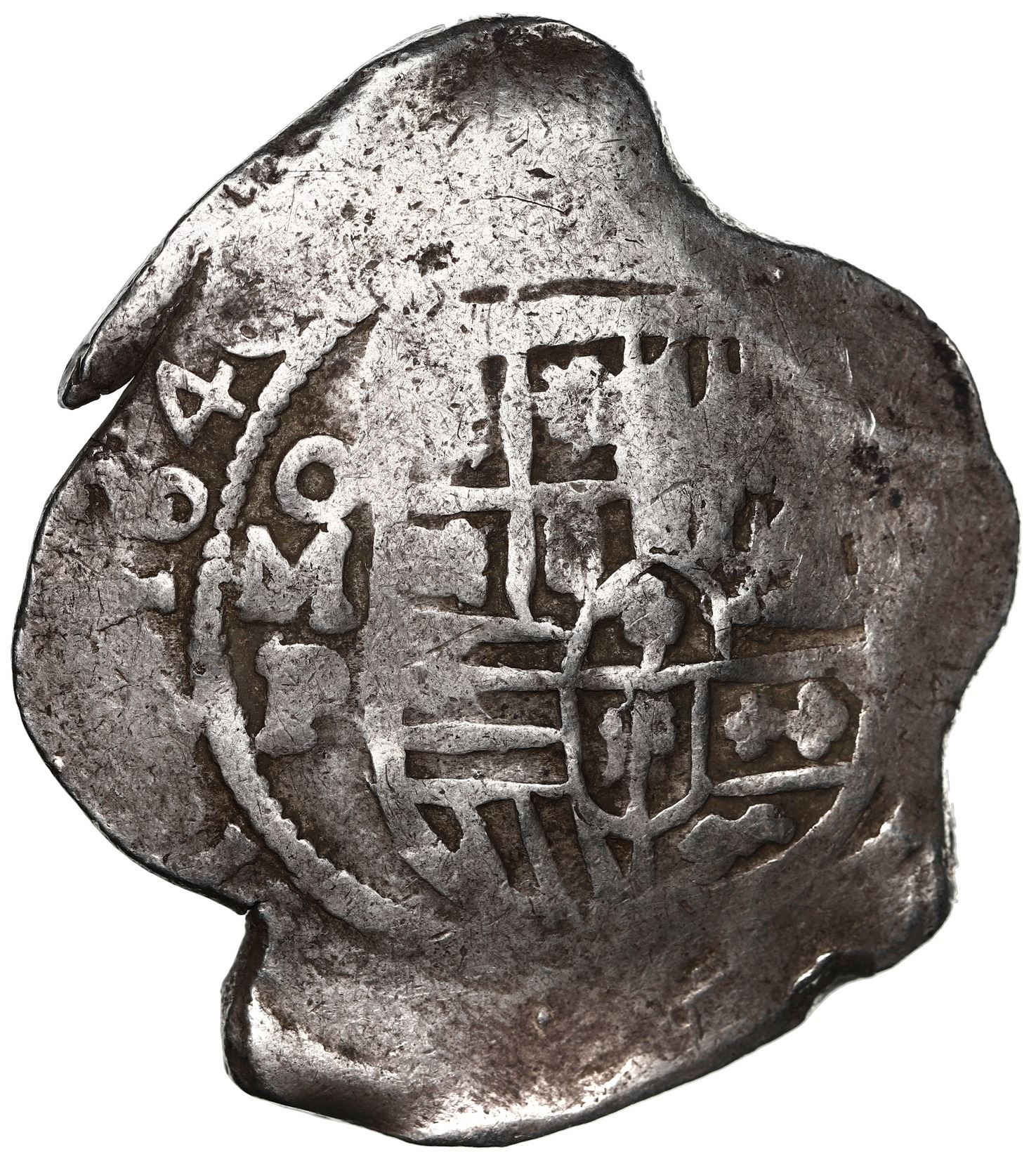Mexico City, Mexico, cob 8 reales, 1646 P, rare. S-M19; KM-45; Cal-1339. 26.55 grams. Irregular flan of varying thickness, with particularly crude edge punctuated by blunted points, yet with clear full date (just the right side of the last digit weak) and oMP next to a full shield, nearly full cross, Fine with light toning and encrustation in crevices.