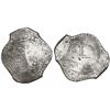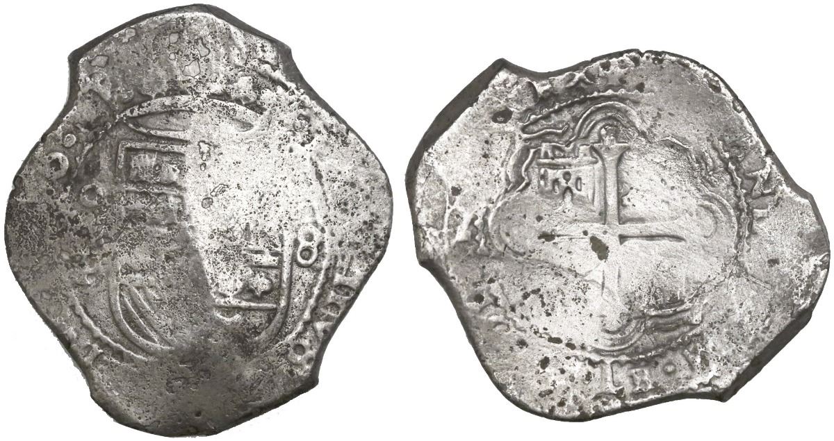 Mexico City, Mexico, cob 8 reales, (165)6P. S-M19; KM-45; CT-363. 27.06 grams. Interesting shape with four rounded points, bold 6 of date and clear denomination 8, VF for wear but with extensive flatness and very light surface corrosion as from unspecified salvage.