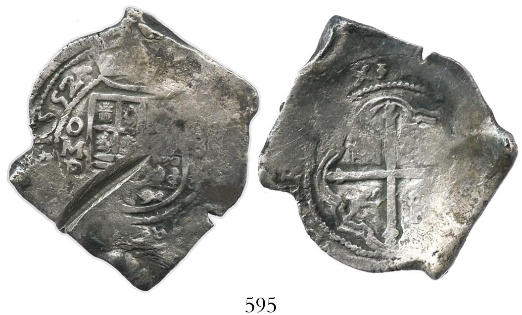 Mexico City, Mexico, cob 8 reales, 1652P. S-M19; KM-45; CT-356. 26.5 grams. Very odd coin with large lacuna on shield, bold date with probable multiple overdates, bold oMP, some flatness but no corrosion to speak of. From the Vergulde Draeck ("Gilt Dragon"), sunk in 1656 off Western Australia.