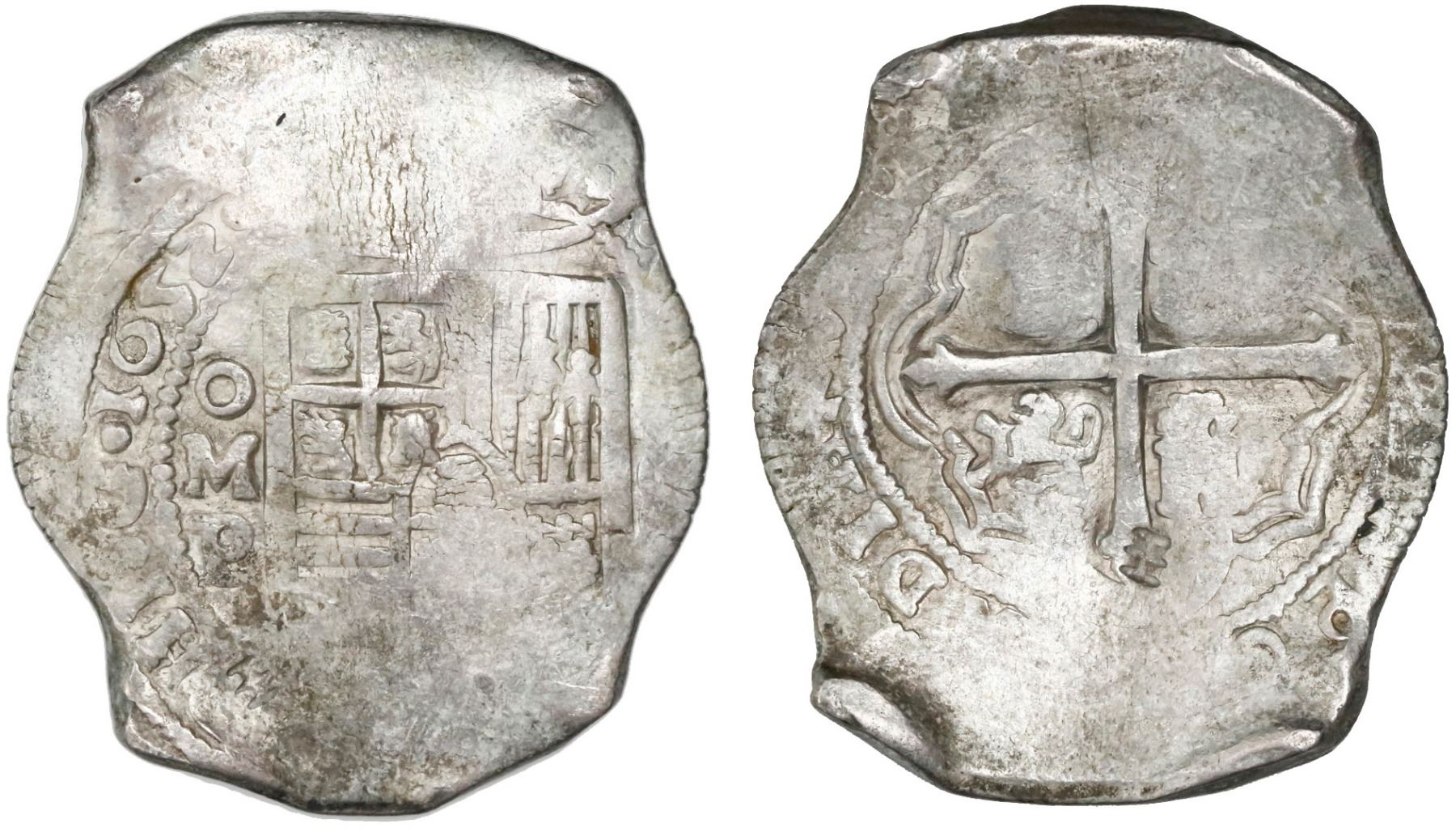 Mexico City, Mexico, cob 8 reales, 1652P, with chopmark as from circulation in Asia. S-M19; KM-45; CT-356. 26.41 grams. Very bold full date and oMP, full cross but incomplete shield, peripherally flat but VF overall, with clear three-tiered chopmark on both sides. Pedigreed to the James Bevill collection.