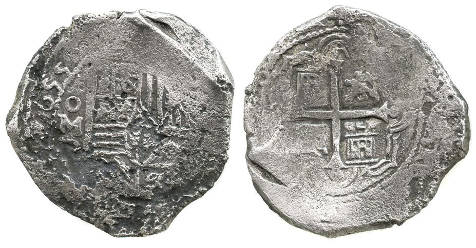 Mexico City, Mexico, cob 8 reales, 1655(P). S-M19; KM-45; CT-362. 23.4 grams. Bold full date and mintmark, full cross and shield but peripheries flat, some moderate surface corrosion, nicely toned, small cut in edge (as made). Recovered from: "Jupiter wreck" (San Miguel el Arcangel), sunk in 1659 off the east coast of Florida