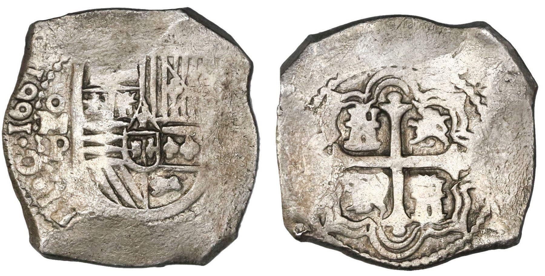 Mexico City, Mexico, cob 8 reales, 1661/0P, very rare. S-M19; KM-45. 26.99 grams. Choice full shield and cross, bold date and oMP, flat peripheries, barrel-shaped flan with blunted points, AVF with very light golden toning.